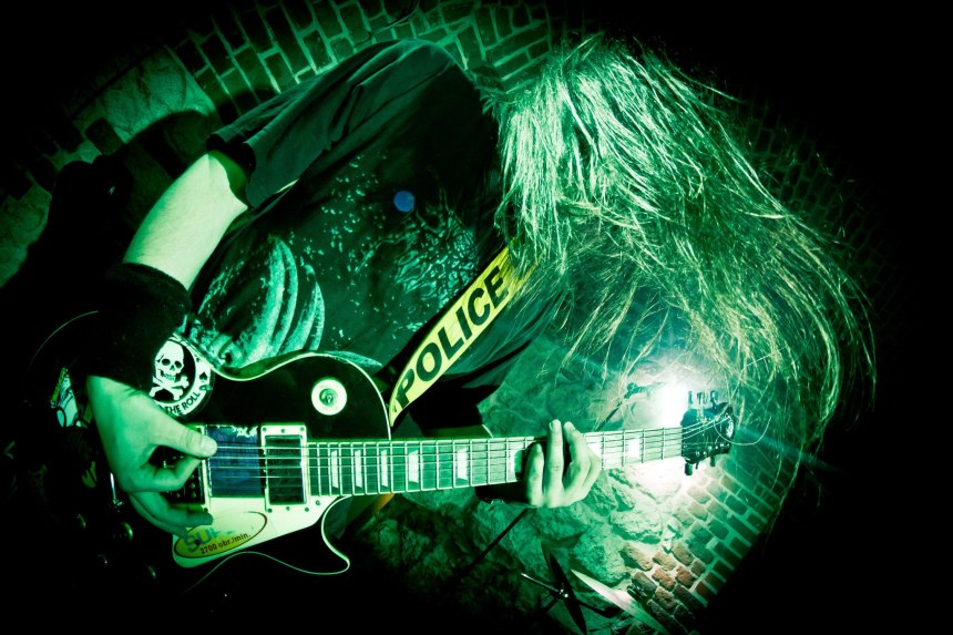 La serata volge al termine e sul palchettino dell’Orange salgono i BELZEBONG, che sorprendentemente riescono ancora a reggersi in piedi. Di tutto l’ampio spettro della cosiddetta musica per fattoni loro fanno parte di quel sotto-sottogenere che preferisco, quindi mi piazzo in prima fila e rimango lì tutto il tempo. Scapocciano per l’intera durata del concerto, con un piccolo proiettore che manda spezzoni di vecchi film opportunamente montati a capocchia e colorati di verde. I pezzi sono tutti strumentali, e praticamente viene suonata tutta la discografia (cinque pezzi di tre quarti d’ora complessivamente) più, immagino, qualcosa dall’imminente Greenferno, che si preannuncia un disco della madonna sia perché sarà identico al precedente sia per il fatto che c’è una canzone che si chiama The UnderToker. Mi piazzo esattamente davanti agli amplificatori e questi per un’oretta abbondante ondeggiano avanti e indietro coi capelli davanti alla faccia al ritmo di un riff ogni dieci minuti e ogni riff fa più o meno VOMMMM VOMMMM VAVAVA VOMMMM con dei bassi che mi fanno tremare gli occhiali e dietro ste cazzo di immagini verdi di qualche film sperimentale degli anni Trenta, roba che se passassi anche solo mezz’ora al giorno così sarei la persona più felice e meno stressata del mondo. E a un certo punto mi guardo intorno e penso che a trentatré anni mi ritrovo qui, a Pescara, in un pub minuscolo, a sentire quattro cannabinomani capelloni su un palco di due metri per due che suonano VOMMM VOMMM a volumi inumani, con le orecchie che già fischiano, con i cinquanta arrosticini di pecora che mi risalgono nel cervello, in mezzo a personaggi assurdi tra cui il Masticatore che mi guarda e ride, un tizio vestito come don Juan Demarco maestro d’amore che si gira intorno spaesato, JU CINGHIALOTTU fermo immobile tutto incagnato dentro al collo che sembra non capire cosa cazzo stia succedendo, un altro che sembra uscito da un concerto di Vasco Rossi e probabilmente prima di entrare immaginava pure di assistere a qualcosa del genere, e io sono stanchissimo, distrutto, co sta birraccia calda da concerto in mano che non mi va più da un pezzo ma che continuo a bere perché è giusto così, e penso che senza tutto questo non sarei nulla. Sarei polvere. Le puzzole saranno pure antipatiche e fetenti, però alla puzzola sta benissimo così e se ti avvicini troppo non importa che tu sia orso o lince: quella ti spruzza zolfo liquido in faccia dal buco del culo. E il bello di tutto ciò è che non importa se il metal esaurirà ogni spinta creativa, o il rock stesso esaurirà ogni spinta creativa: quattro fattoni che suonano qualche riff dei Black Sabbath lentissimo e saturatissimo si troveranno sempre. Noi ci rivedremo sotto quel palco fino all’ultimo. Un grazie ancora a Davide che ha organizzato questa cosa fantastica. (barg)