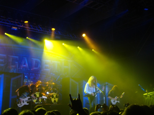 Terminato il delirio si riparte con un altro estratto dal nuovo lavoro, per poi rispolverare i soliti vecchi classici come “A Tout Le Monde”, “Symphony of Destruction”, una sempre letale “Sweating Bullets” per poi chiudere nel bis con “Trust” e l’immancabile “Peace Sells”, cantata a squarciagola da tutto il pubblico come tradizione. Unica piccola nota deludente l’assenza di “In My Darkest Hour”, che mi è stato detto fosse stata suonata a Bologna, ma considerato quello a cui si è assistito stasera ci si può tranquillamente passare sopra. La voce di Mustaine (spesso coperta dal pubblico) devo dire che ha retto abbastanza bene per tutta la durata dello show, riguardo le critiche di alcuni riguardo la poca interazione col pubblico non sarebbe neanche il caso di replicare, considerato che gli show dei Megadeth sono SEMPRE stati così: quattro parole in croce, un pezzo dietro l’altro, poca forma e tanta sostanza, per cui please non rompete li cojoni.