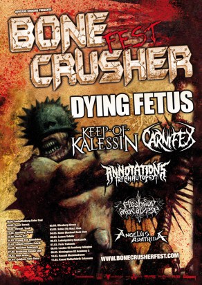 Gli ANNOTATIONS OF AN AUTOPSY sono usciti dalla bill un attimo prima che questa seconda edizione del Bonecrusher Fest iniziasse a menare mazzate in giro per l’Europa, probabilmente per i casini di line-up che negli ultimi mesi hanno funestato l’ensemble deathcore britannico. Quando entro al Blackout sta suonando il gruppo chiamato a sostituirli, i californiani BURNING THE MASSES, piazzati all’inizio della scaletta. Mi dirigo verso il backstage per intervistare i Dying Fetus e mi perdo, francamente senza troppi rimpianti, sia la loro esibizione che quella dei thrasher spagnoli ANGELUS APATRIDA. Mi avvicino al palco che è appena iniziato lo show dei capitolini FLESHGOD APOCALYPSE. Il loro nuovo Ep, Mafia, mi ha fatto un’ottima impressione, quindi ero abbastanza curioso di vederli on stage. I ragazzi mantengono le promesse e ci servono con precisione e ferocia il loro peculiare death metal tecnico. Il flavor sinistramente epico di pezzi come Thru Our Scars e Requiem In Si Minore viene reso perfettamente dal vivo. Il pubblico, non ancora foltissimo, risponde adeguatamente e tributa i dovuti applausi a una delle più belle sorprese venute fuori dall’underground estremo italiano negli ultimi anni. Buona anche la tenuta del palco, favorita anche dal particolare look, che riproduce più o meno quello che capiterebbe se dei tizi in smoking venissero travolti da una carica di rinoceronti. La personalità si dimostra anche con queste piccole cose. Dopo tocca ai CARNIFEX, una band deathcore. Ora, sarà pure giusto che uno si tenga informato sui gusti dei giovani d’oggi ma, dato che il vostro umile cronista stava in giro a sbattere come una trottola dalle prime luci dell’alba, confido di avere la vostra comprensione se ne ho approfittato per andarmi a mangiare una pizza in una birreria fighetta lì vicino, tra le sparute testimonianze di presenza umana in quel contesto postatomico che è Tor Pignattara alle nove di sera. Rimetto piede nel locale che gli statunitensi stanno eseguendo il loro ultimo pezzo. Lo shock culturale per uno della mia generazione è discreto nel vedere una formazione con un physique du role da HC a stelle e strisce (capelli corti, braccia completamente tatuate, magliettine, etc) cimentarsi in un qualcosa che, bene o male, continua a somigliare a del tipico US death metal, a parte quegli stacchi HC scapoccioni a metà pezzo che ho scoperto chiamarsi breakdown. Raccolgo un po’ di commenti in giro. Anche i veterani quarantenni sembrano tutto sommato abbastanza benevoli. Una mia amica, invece, mi dice che quel genere le fa così cacare da averla depressa a tal punto da impedirle di godersi il successivo concerto dei KEEP OF KALESSIN, gruppo che non seguivo dagli esordi. Ne conservavo un ricordo piuttosto grim and frostbitten, per quanto Through Times Of War fosse un disco tutt’altro che grezzo e minimale. Oggi li ritrovo dediti a una specie di black melodico che sa molto più di Svezia che di Norvegia, loro terra d’origine. Dopo lo shock culturale di cui sopra uno però torna a sentirsi a casa vedendo salire sulla ribalta i soliti, rassicuranti, capelloni bambacioni scandinavi in mise nera e pantaloni di pelle. Gli ultimi dischi non li ho ascoltati quindi non ho nulla di particolarmente intelligente da dire se non che mi sono divertito parecchio. E non sembro l’unico, a giudicare dal casino che inizia ad animare il pit. Dopo una prima porzione di set all’insegna dell’epico & maligno, il cantante Thebon, che ha un faccione sorridente da bravo ragazzo montanaro tale che lo presenteresti a tua sorella (pur lasciando emergere degli inequivocabili sintomi di sociopatia nordica quando, tra una canzone e l’altra, lascia al chitarrista l’incombenza di relazionarsi con il pubblico per girarsi verso il muro assorto in chissà quali desolate cogitazioni sulla caducità delle cose materiali), si rivolge così agli astanti: are you ready for some black metal? Partono un paio di estratti dai loro primi lavori, tremolo picking e doppia cassa a martello pneumatico, e viene quasi da sorridere. Che questi qua ora andranno a rappresentare la madrepatria all’Eurovision, quindi non hanno più tutto ‘sto tempo per la guerra al cristianesimo. Nel frattempo l’udienza è cresciuta ma non è quella delle grandi occasioni. Non un deserto tipo la sventurata gig di Grave e Misery Index di qualche mese fa (capitata in contemporanea ai concerti di Cathedral e Joe Satriani nonché al derby ambrosiano) ma siamo al massimo sui centocinquanta paganti. Abbastanza fomentati però, grazie a Satana, da alzare un pogo furibondo quando si accendono i riflettori per gli headliner della serata, i DYING FETUS. Non li vedevo dal vivo da un paio d’anni, quando vennero nella capitale di spalla ai Cannibal Corpse, per portare in giro l’allora fresco di stampa Descent Into Depravity. Mi delusero. Si erano da poco riassestati come trio, il nuovo batterista Trey Williams non sembrava troppo in serata e con una chitarra sola non funzionavano a dovere, si sentiva che mancava qualcosa. Vista la loro ferma intenzione, confermatami dal bassista Sean Beasley nell’intervista che leggerete a breve, di proseguire come three-piece, ero curioso di capire se avessero trovato la quadra. Cazzo se l’hanno trovata. Pretenderei troppo dalle mie sinapsi se mi ricordassi quanto e come siano cambiati gli arrangiamenti (mi è sembrato che le linee di basso seguissero maggiormente la chitarra, compresi quei lancinanti tapping nei riff che sono il marchio di fabbrica dell’act di Annapolis però, appunto, è una sensazione), ma Gallagher e compagni suonano compatti e chirurgici come non mai, alzando un devastante muro sonoro che si abbatte senza pietà sulle nostre povere testoline. Resto a bocca aperta, sono forse la migliore death metal band americana che abbia visto dal vivo di recente insieme ai Nile. Con una spietatezza, un groove e una precisione esecutiva come quelli sfoderati dai Dying Fetus stasera a