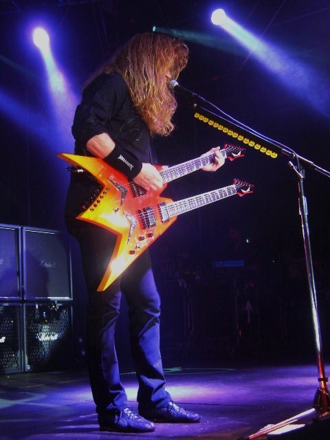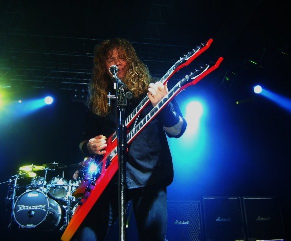 Ero molto curioso di vedere i Megadeth, soprattutto dopo essermi perso come un cretino la tappa capitolina del tour per il ventennale di Rust In Peace, della quale vi parlò a suo tempo Michele Romani. Alla luce di quello che ero riuscito a intuire dai video delle date precedenti caricati dai fan su youtube, le mie aspettative erano piuttosto elevate ma la prestazione di questa sera andrà oltre ogni attesa. Partono infilando di seguito Trust, In My Darkest Hour e Hangar 18 con una precisione e un’irruenza insperate. Unico neo i suoni. Perché, come ha chiosato Aldo, Megadeth coheadliner un par de cojoni. Non tanto per il tempo a disposizione (anche gli Slayer suoneranno un’oretta intensissima sparando un pezzo dietro l’altro freneticamente senza neanche darci il tempo di capire cosa ci avesse colpito) quanto per l’acustica decisamente inferiore a quella inattaccabile della quale godranno i Supremi Emissari del Male Assoluto. Volumi più bassi (non c’è ancora il muro di Marshall che verrà eretto più tardi) e una voce troppo sacrificata nel mix, per quanto non mi sia sembrato affatto che Mustaine avesse qualcosa da mascherare. Osservandolo da pochi metri, nel photo pit, si stenta a credere che compirà mezzo secolo tra pochi mesi. Alla luce di uno show del genere, nel dibattito su Megadave tra Trainspotting e Mighi finisco per trovarmi in larga parte d’accordo con quest’ultimo. Da ragazzino ero di quelli che per darsi un tono affermavano di preferire i Megadeth ai Metallica (non era quasi mai vero). Perché essere metallaro significava prima di tutto essere il più impresentabile possibile di fronte al resto della collettività. Alcuni pezzi dei four horsemen li conoscevano pure le tipe, vuoi mettere quanto era più fico Dave Mustaine che litigava con tutti, insultava i giornalisti, si faceva le pere, aveva avuto una vita borderline e ogni tanto aveva delle uscite che, diciamo, non sarebbero state ben accette in un club di intellettuali radical chic? Perchè l’iracondo frontman è sempre stato un tipo poco raccomandabile detestato da chiunque per il suo pessimo carattere . Ed è anche per questo che è stato uno dei miei principali idoli adolescenziali. E il fatto che sia diventato cristiano rinato, se vogliamo, ci sta pure nel personaggio. E poi stasera sono venuto a sentirmi Peace Sells e Holy Wars suonate come si deve, del resto me ne frega tanto quanto.