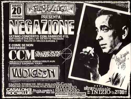 NEGAZIONE Forse la band più rappresentativa e “professionale” dell’HC italiano. Partono da un sound incazzatissimo tipicamente torinese e guidato da un lavoro di chitarra rivoluzionario e vagamente metallizzato. La voce di Zazzo imitatissima. Dopo lo Split coi Declino e i loro primi Ep (tra cui “Tutti pazzi” del 1984), arrivano a produrre “Little dreamer” del 1988 con la tedesca We Bite, un disco che dopo il precedente e fondamentale “Lo spirito continua” (da recuperare assolutamente se amate le sonorità crossover ottantiane) porta finalmente in Italia le influenze più marcatamente thrash metal che l’HC americano sta conoscendo con realtà come i DRI e Suicidal Tendencies. Ciononostante, i Negazione stanno alla larga dalla tamarraggine dei suddetti gruppi e portano avanti una propria intenzionalità melodica e poetica. Forse uno di quei pochi gruppi realmente influenti sia a livello musicale che lirico. “Forse stiamo sbagliando, ma chi sarà mai l’eroe del giusto?”.