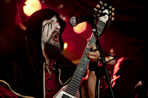 MAYHEM: Dati ormai per spacciati e buffoni da quasi tutti, non è che mi aspettassi granché da loro. E in effetti la band non appare molto convinta. Necrobutcher, come diceva Roberto, fa una figura da alcolisti anonimi, i due chitarristi non si sa manco chi siano, e Hellhammer chi l’ha visto. Ah, poi c’è Attila. Beh, signori. Ho sempre nutrito un certo rispetto per la figura, ma mi sa che siamo arrivati alla fine. Niente altari di Venosa stavolta, si presenta solo con un mezzo teschio attraverso cui guarda il pubblico e un cappio che fa penzolare di tanto in tanto. La cosa che fa più paura, comunque, è lo stato della sua dentatura, in evidente bisogno di cure. Come pendant al discorso sugli Enslaved, io continuo a preferire l’Attila che si prendeva meno sul serio ed evitava di ricordare ai presenti che i Mayhem esistono da 27 anni (orazione tenuta rigorosamente in growl), come se non lo sapessimo già. Io preferisco quella volta che sputtanò i soldi di Roberto Mammarella registrando Recipe Ferrum, una delle porcherie più geniali della storia del black metal. Per quanto riguarda la setlist, cosa volete che abbiano suonato – i Mayhem hanno fatto un album e mezzo di valore immenso ed è giusto saccheggiare da lì.
