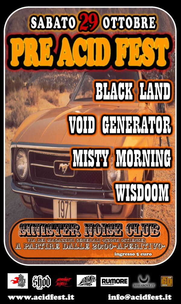 C’era una volta – e speriamo torni a esserci molto presto – lo Stoned Hand Of Doom, appuntamento immancabile per tutti gli adepti del Sabba Nero che per sei edizioni portò nella capitale mostri sacri come Electric Wizard e Orange Goblin, affiancati da un mucchio di band strafiche sia italiani che internazionali. Quest’anno non si è tenuto, noi ci sentiamo un po’ orfani e, nell’auspicio che tutto torni alla (ab)normalità quello venturo, ci consoliamo con questo Acid Fest, lisergica kermesse spinta più sul versante space e acid rock che su quello prettamente metal. La speranza è quella di poter godere di entrambi i festival nel 2012, unendo doomster e appassionati di viaggi intergalattici in un unico abbraccio fatto di Marshall, pantaloni a zampa e tenere piantine con un buon odore. A galvanizzare i sabbathiani di più stretta osservanza  ha provveduto però la serata di riscaldamento, il Pre Acid Fest ospitato dal Sinister Noise. Quattro gruppi, tutti romani, a ribadire come queste sonorità abbiano sempre trovato terreno piuttosto fertile nel sottosuolo della città eterna.