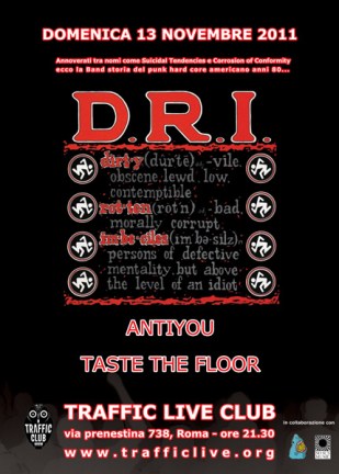 Arriviamo al Traffic intorno alle 22.30. Ci godiamo la vista delle solite giacche smanicate decorate con toppe dei vari Exodus, Suicidal Tendencies e via discorrendo. C’é perfino un tipo che indossa una t-shirt dei Gehennah (sì, proprio quelli con la “h” finale) e Ciccio prontamente gli fa i complimenti per la ricercatezza e l’originalità. Inutile dire che mi associo alle lodi.Una birretta veloce e un paio di sigarette mentre ascoltiamo  distrattamente i pezzi del gruppo spalla, gli israeliani Hammercult, da poco fuori con il loro ep d’esordio Rise Of The Hammer e subentrati in seguito al forfait degli Anti You (arriviamo purtroppo troppo tardi per la performance dei capitolini Taste The Floor). All’improvviso sentiamo da fuori le prime note di All For Nothing ed immediatamente buttiamo le cicche, svuotiamo i bicchieri ed entriamo. I D.R.I. partono con Beneath The Wheel e l’ambiente inizia a riscaldarsi. Manco il tempo di far cominciare Acid Rain e… BAM! Ecco che il primo disgraziato avventore della fossa dei leoni viene portato via di peso. E mentre io e il buon Ciccio ci facciamo una scommessina su quale sia l’arto rotto,  le prime vittime si ritirano sconfitte lasciandoci lo spazio per avvicinarci ulteriormente alla “zona rossa”, giusto in tempo per la gloriosa Thrashard… Come si fa a resistere? Ci lanciamo dentro l’inferno come forsennati, tra stage diving e altre sane attività cui si è solitamente dediti in occasioni di questo tipo. Evitiamo due o tre interventi a gamba tesa ed ecco che i nostri attaccano con Probation, da quell’immortale capolavoro che è Crossover. Kurt è in gran forma, Harald Oimoen fa il buffone e Spike ha un suono di chitarra che spacca il culo (ottima l’acustica, a proposito).C’è spazio anche per qualche estratto da quello che fu il loro ultimo album in studio, ovvero quel Full Speed Ahead che ormai da troppo tempo aspetta un successore. Via quindi con I’m The Liar. Qualcuno sale sul palco e suggerisce ad Harald due paroline nell’italico idioma che, ci scommetto, non farebbero contento nessun cristiano cattolico apostolico romano praticante. Lui le ripete, mandando il foltissimo pubblico in visibilio. E’ poi la volta di alcuni classici come I Don’ t Need Society, tratta dal loro primo lp. Si scatena nuovamente l’inferno, e qualche stage diver viene portato via dalla folla verso il fondo della sala. Non lo vedrò mai più. Il pubblico continua a richiedere alcuni dei pezzi più amati ed ecco che, dopo averli eseguiti, Kurt dà la buona notte. Ma è solo una finta, perché i nostri non ci hanno ancora regalato pezzi come Who Am I, Abduction , la mitica Dead In A Ditch e Violent Pacification, con quel finale terrificante che manda la folla in delirio in un turbinio di spintoni, gomitate e gente che ti vola sopra la testa. Inutile dire che scoppia di nuovo la baraonda quando viene eseguito un inno ai piaceri della vendetta come The Five Years Plan. Dopodiché la serata è davvero finita e tutti contenti ci ritiriamo verso le nostre abitazioni completamente sudati e con un piacevole freschetto notturno di poco superiore allo zero. Vuol dire che se mi buscherò una polmonite, almeno morirò contento. (Piero Tola)