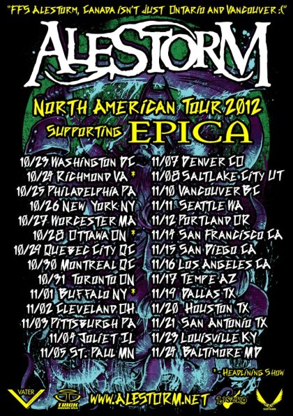 Il mondo gira in maniera sbagliata e noi tutti abbiamo la maledizione di vivere nel peggiore dei mondi possibili. Quando Lady Gaga va in tour, i telegiornali ne parlano per settimane e ci fanno programmi apposta. Quando gli Alestorm sbarcano oltreoceano sono costretti a farsi promozione quasi da soli. Del resto, se la casa di promozione organizza un tour nordamericano in cui la band di Christopher Bowes fa da supporto agli Epica (che tristezza), c’è poco da fidarsi. E dunque, supponiamo poco soddisfatti della promozione, i pirati scozzesi hanno postato sulla propria pagina facebook queste immagini, evidentemente ideate e realizzate dopo essersi vomitati addosso svariate volte in una serata-sfascio: