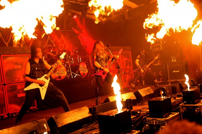 Il pubblico impazzisce quando il buon vecchio Peter (al secolo Piotr Wiwczarek) sale sul palco con i suoi. Giocano in casa, e si vede. Inizia lo show, con tanto di effetti pirotecnici, compreso un “barbecue” che si accende di tanto in tanto a mo’ di fiamme infernali sullo sfondo del palco. Al centro volano persone oltre le transenne. Dalla mia parte solo sfigati col cellulare in mano tutto il tempo. Ne spingo via bruscamente uno particolarmente rompicoglioni con le braccia poggiate sopra la mia testa. Vaffanculo. Meglio la carneficina della “fossa” centrale, ma muoversi non è facile per via della massa impressionante di gente intorno a me.