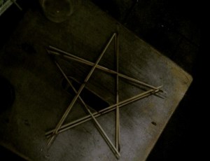 L’appuntamento è di nuovo al Signore delle Pecore, che fa quegli arrosticini di fegato che piacciono tanto a noi e ai nostri gastroenterologi di fiducia. Ci fanno aspettare un’ora, passata tra insulti al Masticatore che non scrive mai niente ed evocazioni al demonio tramite pentacoli fatti con gli stecchini degli arrosticini (vedi immagine a lato), quindi ci perdiamo l’esibizione degli HYPERWULFF che alcuni di noi aspettavano con tanta ansia. Arriviamo però in tempo per lo show acustico degli SHORES OF NULL, l’altra band di Davide Straccione, ma mentre ci attardavamo dieci minuti fuori per mangiare una fetta di torta arriva un tizio, probabilmente dell’organizzazione anche lui, e ci dice che ci sono i Belzebong che vorrebbero mangiare una fetta di torta con noi. Del resto i Belzebong richiamano le fette di torta anche nel proprio moniker, quindi è un dovere morale condividerle con loro. Ci dispiace quindi per gli Shores of Null, che piacciono molto a tutti noi, ma del resto intrattenendo gli headliner stiamo facendo un utile servizio che ci fa sentire a posto con la coscienza. I polacchi contraccambiano con una vodka che, giurano, è fatta da alcune erbette che vengono contrabbandate in Polonia dalla Bielorussia. Gli chiedo se in futuro sono disponibili per un’intervista e uno di loro mi guarda con gli occhi stravolti: “Adesso?”. No, non adesso, caro il mio fattone, lo vedo che al momento non sei neanche in grado di ricordarti il tuo nome. Facciamo foto di gruppo, cazzeggiamo, ci diamo pacche sulle spalle e ci diamo appuntamento a dopo, perché adesso suonano i METHADONE SKIES, dalla Romania, che i miei sodali giurano essere molto carini. Dovete però scusarmi, cari fratelli del vero metal, ma non me ne ricordo una sola nota. Ho fatto indigestione di fette di torta insieme ai Belzebong e quindi sto lì, caracollo un po’ davanti al palco, vado a comprare una maglietta dei Belzebong, guardo i cd in esposizione, parlo dei Blind Guardian con una fan dei Blind Guardian, eccetera. Ma niente dei Methadone Skies rimane nel mio cervello, perdonatemi.