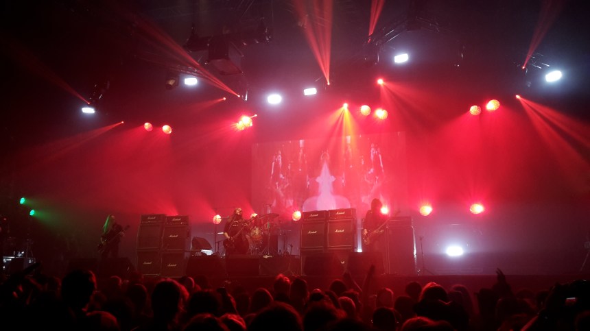 Ancora pensoso mi vado a vedere i Primus, che però restano una di quelle robe che non capivo e continuo a non capire. Roba troppo da persone intelligenti per i miei standard. La gente invece apprezza e non poco, e anche io per una volta godo del loro piacere. A seguire mi concedo un paio di pezzi di Aero-Vederci, ma giusto due che devo andare a prendere posti per vedere il mio amico John Garcia. Quello che segue è uno dei concerti più belli dei tre giorni, forse il più bello. Tra tutte le varie cose rimesse insieme dal chicano negli ultimi anni questa degli Slo-Burn mi è sembrata la più seria di tutte, la band è in pallissima, il suono grasso e preciso. I pezzi nuovi di primo acchitto mi sembrano anche più belli quelli classici. Se queste sono le premesse quando l’album uscirà sarà un gran bel sentire. Grandissima prestazione, uno di quegli apici assoluti che invoca una birretta in più anche se nei hai già prese trecento. Perché quando si incontra la perfezione bisogna usufruirne al massimo. Sugli altri palchi ci sarebbero pure altre cose ma stiamo davvero tutti cotti e quindi con Mille Petrozza che ci strilla nelle orecchie cominciamo a prendere la via d’uscita.