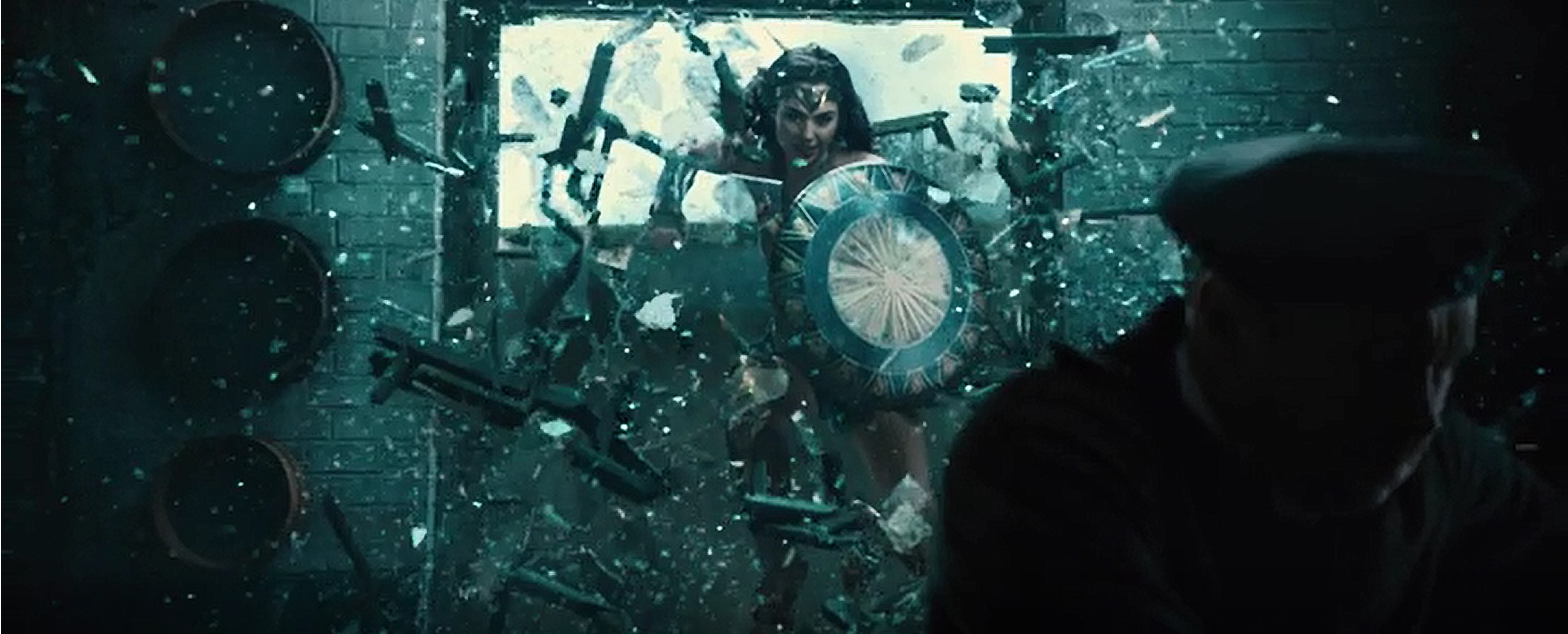 Quindi ricapitoliamo: ci sono Wonder Woman, un americano, un marocchino, SPUD e il grande capo Toto contro i teteschi malvagi. Che, scopriamo, hanno reso SCHIAVI i belgi catturati. Bello, il revisionismo storico. A questo punto, in un capolavoro di brutto cinema, lei sfonda la resistenza nemica correndo da sola contro il fronte tedesco e deviando le pallottole con i suoi fenomenali bracciali del potere. Ecco un’altra cosa ridicola del film: questa che devia le pallottole agitando le braccia è una cosa grottesca e implausibile; una volta ogni tanto va bene, ma farlo per due ore abbondanti di film è un insulto a quei poveracci che hanno avuto la sfortuna di spenderci soldi.