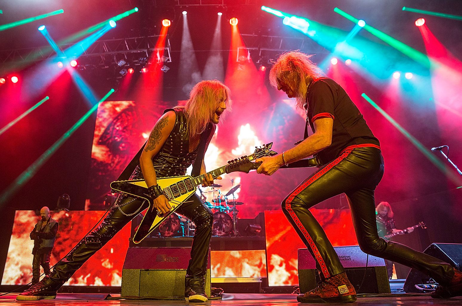 Secondo me Halford, coadiuvato da Richie Faulkner, si è occupato quasi totalmente della composizione di Firepower, con giusto un apporto minimale da Tipton (purtroppo malato di Parkinson), che risulta comunque nei crediti di tutti i pezzi. D’altronde anche Made of Metal venne scritto praticamente dal solo Halford, che come compositore va molto forte quando non ha grilli di sorta per la testa (tipo dover suonare per forza moderno o avulso dai Judas Priest – un po’ come capitò a Bruce Dickinson con gli Skunkworks) e quindi risulta creativo come meglio gli riesce, ovvero come uno che ha passato tutta la vita a cantare heavy metal nei Judas Priest: sa fare giusto quello, sa farlo divinamente e sa bene quali corde toccare quando compone. Ed è tanto più evidente quello che scrivo tanto più si ascolta la prestazione vocale di Rob su questo disco, la si confronta prima con quella di Reedemer of Souls e poi con Made of Metal: è evidente che in Reedemer suona forzato e svociato, mentre sia su Firepower che su Made of Metal canta splendidamente, ovviamente senza i picchi vocali di gioventù ma proprio per quello senza affanni o patemi, con una voce matura, decisa, perfettamente a suo agio su tonalità medie o medio-basse con qualche occasionale puntata in alto che abbellisce senza appesantire, insomma come un vero cantante di razza dovrebbe cantare alla soglia dei settant’anni.