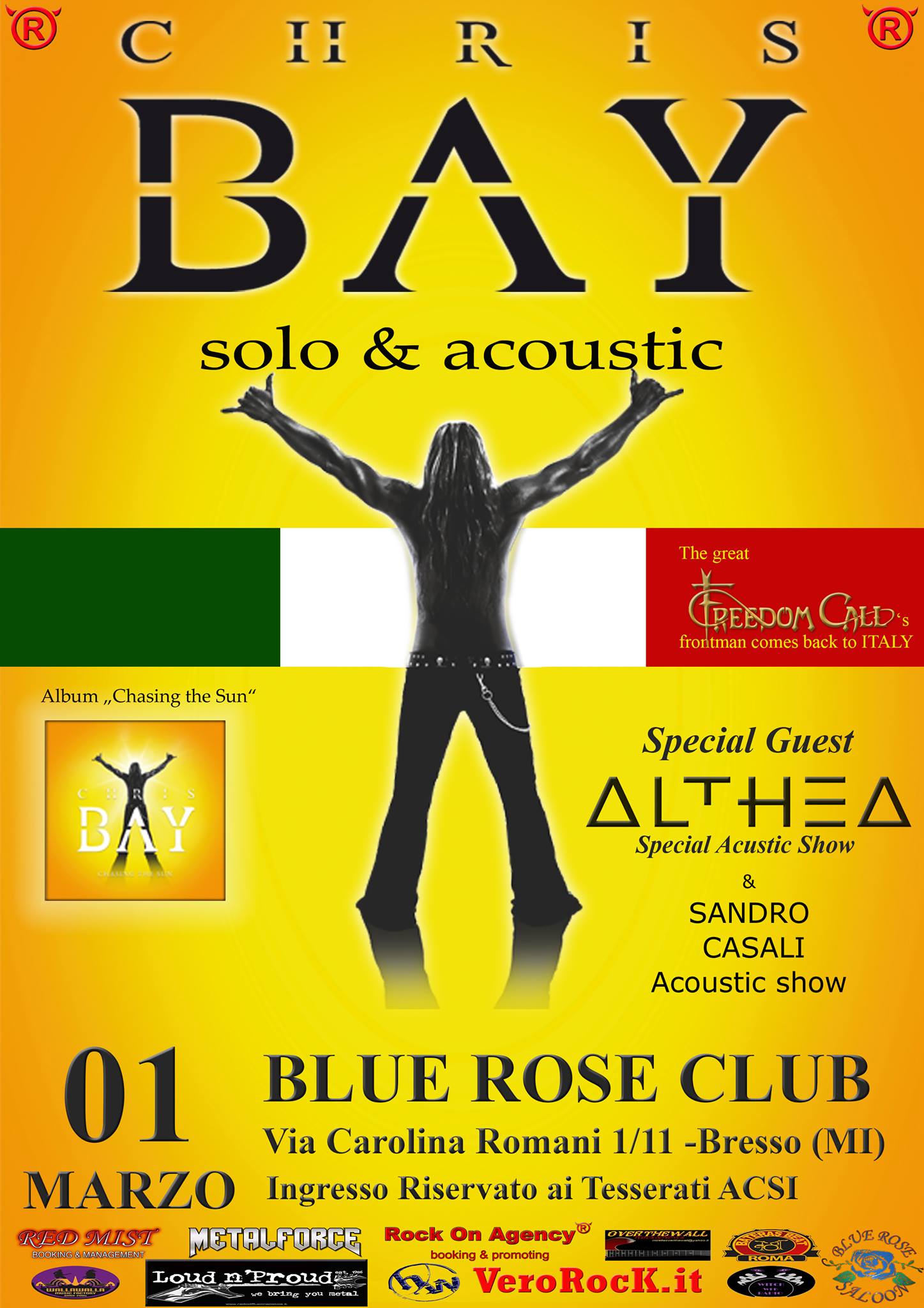Dopodiché salgono sul palco gli Althea, anche loro in acustico, con una formazione ridotta a due elementi. Sono milanesi e suonano qualcosa di accostabile al prog metal: toccherà rivederli in un’altra occasione però, perché la dimensione acustica chitarra/voce sembrerebbe non rendere come l’originale. Suonano comunque pochissimo finché a un certo punto sale sul palco Chris Bay insieme a Joschi Joachimsthaler, il chitarrista che lo accompagna in alcune date. Come si vede nel video qui sopra, alternano pezzi del disco solista ad alcuni grandi classici dei Freedom Call, come The Quest o l’eponima. C’è poca gente, ma lui riesce comunque a coinvolgerci con l’entusiasmo di chi si trova davanti un palazzetto pieno. E poi, anche in versione voce e chitarra acustica, anche davanti a un pugno di spettatori in un pub, anche quando sei stanco e assonnato, quel personaggio ha il potere di farti prendere bene come nessun altro riesce a fare, eguagliato forse solo dal mio cagnolino quando vuole giocare e inizia a muoversi in maniera sconnessa. Alla fine però anche Chris e Joschi stanno sul palco poco, decisamente troppo poco, suonando forse meno di dieci pezzi; e quando tutto finisce ci guardiamo in faccia e ci ritroviamo il tipico sorriso post-concerto dei Freedom Call. Amici del vero metal, non so che altro dire se non che Chris Bay è il migliore sostituto degli psicofarmaci attualmente sulla piazza. E sì, la voce brutta che sentite cantare i ritornelli nel video qui sotto è la mia, purtroppo. (barg)