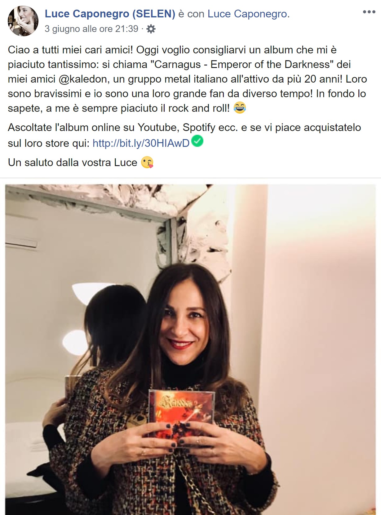 Di Selen sappiamo tutto e il contrario di tutto, e intendo letteralmente. Non ci risultava però finora una passione per il power metal in stile canto d’eunuco e frullar di cassa (citazione coltissima, gloria a chi la coglie). I Kaledon poi sembrano, immagino loro malgrado, abbonati al trash: la stragrande maggioranza di noi li conobbe ai tempi del secondo album grazie ad una mirabile versione pecoreccia firmata da Christian Ice della loro The New Kingdom, che ci insegnò i lati positivi del vivere con la costante minaccia di un pelato e un laziale. Non sappiamo se il supporto dell’ottima Selen frutterà loro la gloria eterna, ma di certo guardando l’immagine li sentiamo un pochino più nostri.