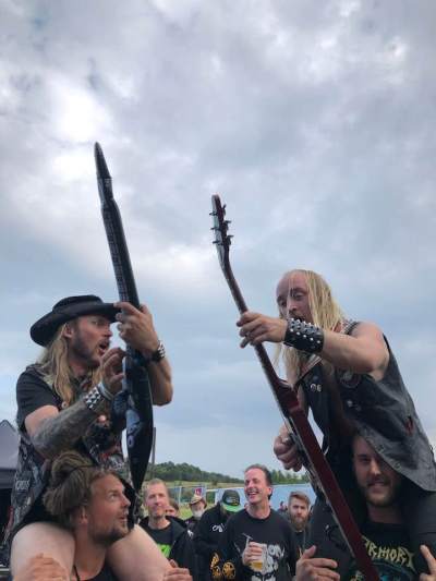 Arrivo al festival verso le sette e mezza, il che significa che mi perdo Heine Thomsen, Deus Otiosus, Killing, Nyredolk, Chevalier (recuperati in seguito, una roba folle), Phrenelith, Armory e Ascended Dead. Il sito è piuttosto lontano, più di mezz’ora a piedi dal centro, nel mezzo di una vallata verdeggiante che di giorno ospita la fattoria aperta di cui sopra (i primi concerti del sabato li sentirò a distanza, giocando con la piccina). La prima impressione conferma i buoni presupposti della partenza: il prato è piccolo ma rigoglioso, i pochi stand, montati da una schiera di volontari recuperati tra la gioventù locale, sono ruspanti ma funzionali, e soprattutto la birra costa 2,5 euro (ditemi voi dove altro trovate prezzi così). Ci sono anche le birre artigianali tanto care alla redazione (a soli 5 euro) e una cucina zozza come si deve, ma di origine quasi esclusivamente biologica. Il Metal Magic ha due palchi, uno all’aperto e uno più piccolo in un tendone, delle dimensioni di un piccolo club. I concerti si alternano sui due palchi e la scaletta è rispettata al minuto. Operiamo comunque su numeri piuttosto contenuti – nel momento di massima capienza, credo che non si superassero le duemila persone.