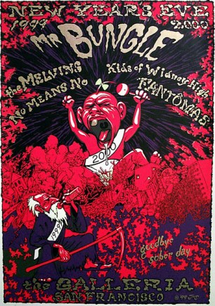 Doppelgänger di professione, i Mr. Bungle iniziano la loro folle carriera nella prima metà degli anni ’80, e nel 1986 danno alle stampe un improbabile disco di esordio, The Raging Wrath of the Easter Bunny, 35 minuti di death metal, hardcore o quel che è, registrato una chiavica (nel giorno di Pasqua), che gli consente di spassarsela per concerti nella contea di Humboldt, California, indossando maschere di halloween e facendo casino tanto per fare. In seguito tirano fuori tre cassettine che neanche io ho avuto il coraggio di ascoltare, per poi firmare con la Warner Bros. e diventare un nome abbastanza conosciuto. L’omonimo album prodotto da John Zorn, Mr. Bungle (il nome è quello di un personaggio di un vecchio programma HBO che doveva insegnare le buone maniere ai bambini), considerato spesso come il primo disco a tutti gli effetti, è un vero casino. Il “secondo”, Disco Volante, pure. Questi due non li ho mai apprezzati nella loro interezza ma, a mia parziale discolpa, credo che per farlo bisogna essere affetti da una qualche forma di bipolarismo ed io, tutto sommato, sono una persona abbastanza stabile. Ascoltandoli entrambi si nota subito, però, come il frusto parallelismo follia/genio non sia solo un luogo comune. Il marchio di fabbrica di Mike Patton, Trey Spruance e Trevor Dunn, amici del liceo e in seguito membri di Faith No More (i primi due) e di Fantomas (il terzo e il primo), è il mischiare i generi musicali all’interno di un album ma anche di una singola canzone: metal, rock’n’roll, noise, indie, grunge, jazz, blues, swing, doo-wop, pop, folk, elettronica, araba, hawaiana, balcanica, ska, funk, tango, surf, klezmer, fusion, punk, rumorismo.