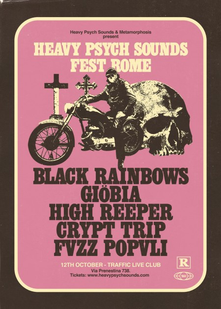 Dopo le edizioni tenutesi in Inghilterra, Belgio, Olanda, Austria e Usa, la label torna così a casa e headliner sono i Black Rainbows, la band del patron Gabriele Fiori. A seguire la psichedelia allucinata dei milanesi Giöbia, il doom sabbathiano degli americani High Reeper, da poco fuori con il secondo disco, i texani Crypt Trip, forse il gruppo dalle sonorità più vintage del lotto, e i Fvzz Popvli, giovane realtà dell’underground dell’Urbe di cui vi abbiamo già parlato su questi schermi. Chi non viene è un sobrio.