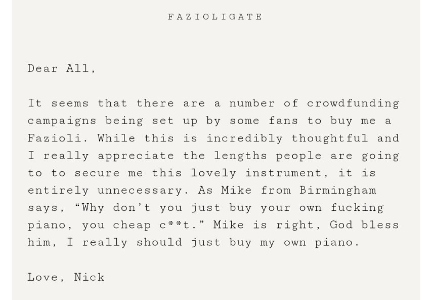 Solo che quest’ultima, cari amici, non è la nostra ennesima boutade, bensì la realtà: i fan di Nick Cave hanno scritto veramente in massa alla Fazioli, tanto che il buon Cave ha dovuto scrivere una successiva comunicazione ai suoi zeloti invitandoli alla calma, dicendo che si trattava di una cosa scherzosa e, insomma, dai che cazzo regà: The tsunami of mail has left our friends at Fazioli a little shaken, so while I love you all – no more mails to Fazioli please! They are wonderful people. La realtà supera sempre la più fervida fantasia. (Charles)
