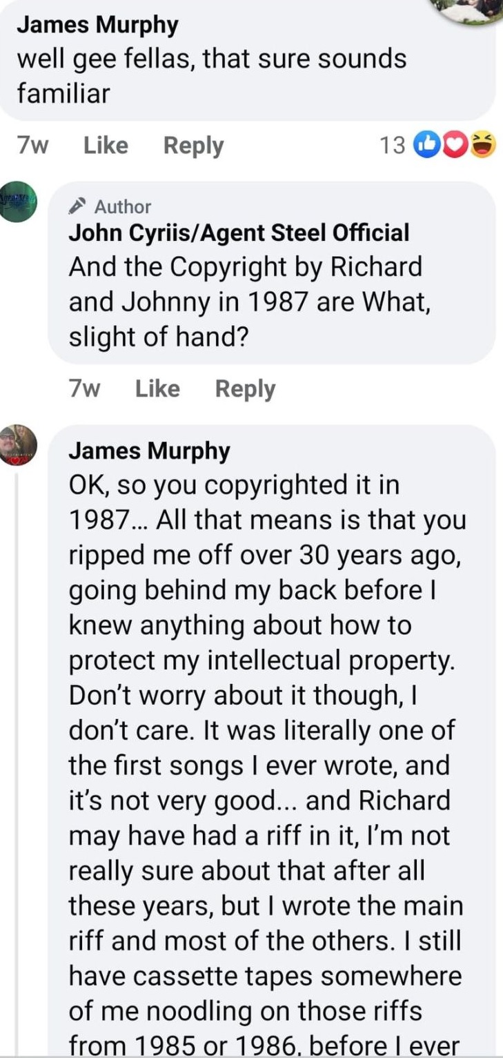 In sostanza nasce questo dibattito su una vecchia canzone la cui paternità sarebbe, a detta di James Murphy, quanto meno da condividere con lui. Dall’altra parte del tavolo s’attribuisce un riff a Richard Bateman, bassista, turnista con gli Agent Steel nel 1987 nonché membro storico dei Nasty Savage: