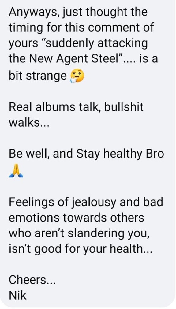 A quel punto è tardi: interviene Nik. Ora, esistono molteplici teorie su Nik: che sia un parente intento a prender le difese per mezzo di toni ammorbanti, oppure il classico cugino che s’è impossessato della tastiera e ha preso a vomitare odio, classica scusa italiana che utilizziamo nel Bel Paese ogni qualvolta che qualcuno sfora in rete o tramite la messaggistica gratuita del cellulare. Nik, che non è la prima volta che compare sul profilo ufficiale degli Agent Steel, interviene qui con la delicatezza tipica di chi si sta rivolgendo a uno che di recente le ha passate proprio di ogni colore:
