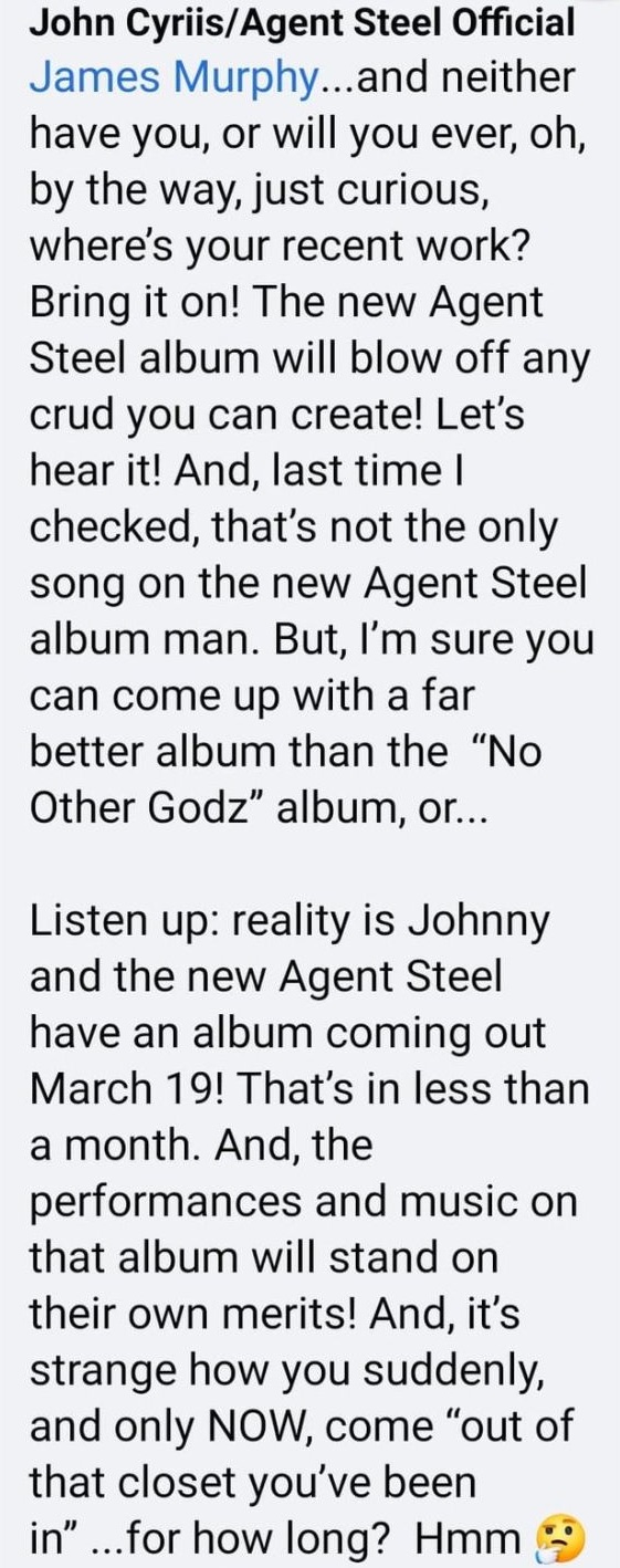 James Murphy comprende il degenerare della situazione, e, supportato dagli sghignazzanti like dei lettori, la butta in caciara senza però infierire. Più che altro sembra non fregargliene niente di quel vecchio ammasso di riff, ma erano comunque suoi e ci tiene a precisarlo: