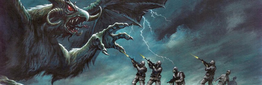 Sono rimasto a osservare questa copertina per almeno cinque minuti, inebetito dal dominio del nonsense. Quello scoglio pieno di militi armati di fucili d’assalto, bardati all’inverosimile e intenti a sparare verso l’alto, tranne il quinto da sinistra, che sembra rimpiangere di non essere davanti al televisore a godersi una Becks e la replica di Leicester – Wolverhampton. Che regista, Ruben Neves. In alto sfrecciano gli aeroplani presi in prestito dal debutto dei Raise Hell, una sorta di F35 del metallo che, di tanto in tanto, qualcuno mette nelle copertine per vedere che effetto fanno. Il primo di questi va palesemente oltre il bersaglio, segno che la partita della Premier interessa pure a lui. E poi c’è il mostro. C’è mostro e mostro. Ci sono quelli che disegna Girardi, a volte demoniaci golem di roccia appena rintracciabili nell’immagine e camuffati in immense montagne, in altri casi in primo piano nonché palesemente a cazzo di fuori. E poi c’è il mostro Capitalismo che domina gli incubi di Ed Repka. Infine ci sono i mostri giapponesi.