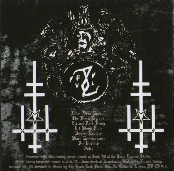 Terminata l’esperienza con i Torgeist, Black Lord aveva portato avanti il suo progetto dark ambient Amaka Hahina, roba che fa seriamente dubitare delle facoltà mentali di chi l’ha composta e che, per quanto mi riguarda, è indigeribile. Per chi fosse interessato, tutte le sue uscite sono fuori per Drakkar e credo si trovino ancora. Consapevole però di non aver esaurito la sua follia black metal con i Torgeist, il Nostro si è inventato il progetto solista/solitario Vermeth, il cui debutto nel 2001 fu abbastanza sorprendente perché se ne parlò pochissimo e perché Drakkar non si sbattè più di tanto a promozionarlo, “tanto è roba per pochi”, credo abbia pensato Noktu. Di Your Ruin… possiamo tranquillamente parlare come l’ultimo picco musicale uscito in terra francese a nome Black Legions. Vero, negli anni Belketre, Vordbr, Moevot ed altri hanno continuato a pubblicare dischi, sporadicamente. Ma su questi livelli non c’è mai più arrivato nessuno. Your Ruin… è l’epilogo delle Black Legions, di quelle vere. Uno degli apici di tutto il filone, per di più.