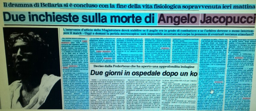 In quel momento probabilmente dentro di lui scatta qualcosa. Forse gli saranno tornate in mente le scazzottate di Tarquinia, quando ne stendeva due o tre alla volta; forse, in quei secondi, gli saranno ripiombate nel cervello tutte le critiche ricevute in passato da pubblico e media, nonostante i titoli conquistati, per il suo modo di combattere controllato; forse si rende conto che se non lo butta giù potrebbe perdere ai punti… Non sapremo mai cosa sia successo. Minter, ancora incredibilmente freschissimo, ne approfitta, gli scarica addosso una terrificante serie di pugni al volto e Jacopucci finisce per terra. L’arbitro conta. È finita. Minter è il nuovo campione europeo. Per festeggiare il titolo, l’inglese ed il suo staff vanno a mangiare fuori. C’è anche Jacopucci, che è un uomo dotato di grande fair play. Alla fine della serata, Angelo comincia a vomitare. C’è chi pensa che abbia bevuto troppo. Poco dopo essere rientrato in albergo, improvvisamente entra in coma. La sequenza finale con cui Minter lo ha messo ko gli ha provocato un’emorragia cerebrale. Trasportato d’urgenza in ospedale, muore tre giorni dopo, esattamente cinque mesi prima del suo trentesimo compleanno.