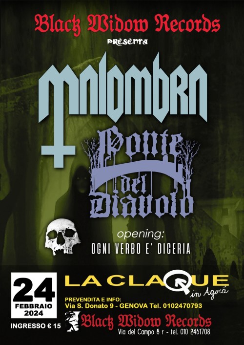 Lo stesso sabato 24 c’è un appuntamento da non perdere a Genova: i Malombra si esibiranno al La Claque in Agorà, accompagnati da Il Ponte del Diavolo e Ogni Verbo è Diceria. Organizza, ovviamente, la gloriosa Black Widow records.