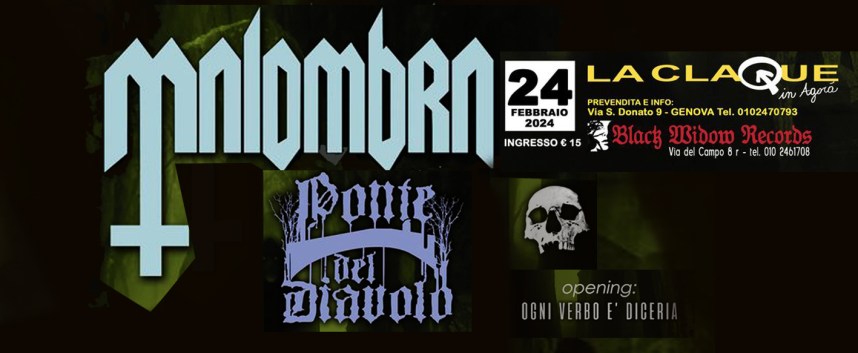 Arriviamo al locale puntualissimi dopo aver cazzeggiato un paio di orette nei vicoli di Genova, le zone dello struscio che in primavera o estate straripano di ragazzini e matricole universitarie che si prendono la birretta, il drink, il chupito, e che fanno giustamente gli scemi. Stasera però è un po’ più freddo delle insolite giornate precedenti, ha pure piovuto il giusto per far salire l’umidità, e i Caruggi sono insolitamente vuoti per essere un sabato sera. Dunque la serata è perfetta per ascoltare doom, e gli astri si allineano al punto che oggi pure lo Stregone Fumogeno El Greco e suo fratello sono della partita, convinti definitivamente alla trasferta genovese dalla presenza in cartellone dei Ponte del Diavolo, band torinese che pare stia raccogliendo rapidamente consensi tra i devoti della musica dedicata al capro. Tutti comunque mossi dalla curiosità per i Malombra, perché T.R.E.S. qui in redazione è piaciuto a molti, me compreso. Arriviamo presso il locale in orario, ma la serata inizia con un sensibile ritardo per motivi tecnici, come chiarito successivamente dall’organizzazione. Da un certo punto di vista poco male perché riesco a fare un giro nel locale, fare due chiacchiere con un paio di conoscenze della Genova-bene metallara e passare dal banchetto dei Malombra da cui scorgo un soddisfatto Massimo Gasperini, deus ex machina della storica Black Widow, perché il locale si sta riempiendo nonostante ci siano almeno un paio di altri eventi la stessa sera. Per inciso, sarebbe proprio stato un peccato il contrario.
