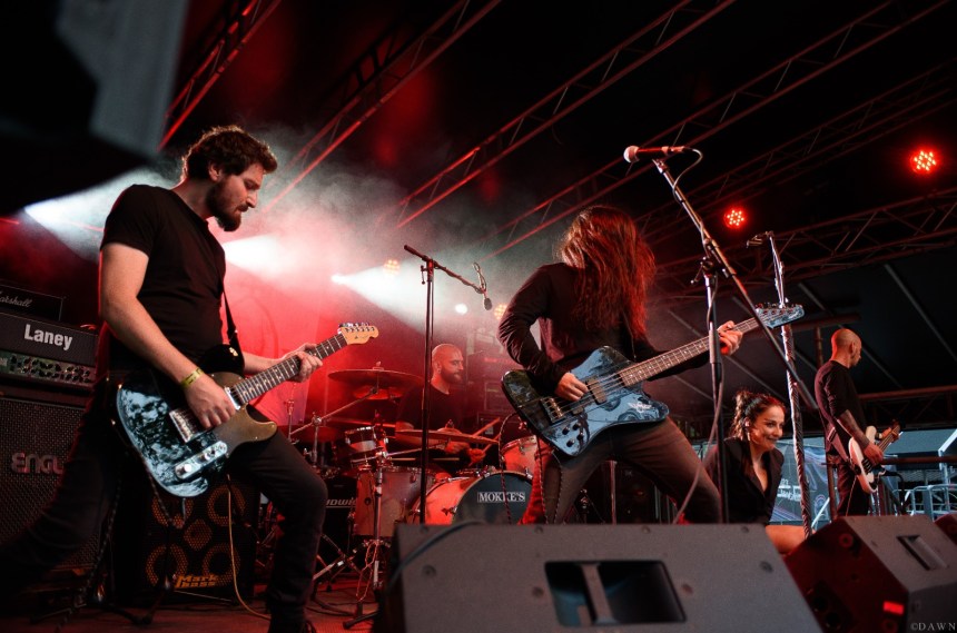Quando iniziano i Ponte del Diavolo la serata decolla definitivamente, un piede caprino inscritto nel logo del gruppo viene proiettato alle spalle del palco e i musici prendono il loro posto sul palco. Mi impressionano perché girano molto meglio che su disco e si rendono protagonisti di un concerto incredibile, coinvolgente e gestito benissimo. Non sto a fare la disamina pezzo per pezzo perché il disco l’ho ascoltato solo distrattamente pochi giorni prima del concerto e ho deciso che avrei voluto approfondire la sera stessa, e devo dire che hanno spaccato tutto. Mi è piaciuta molto anche la cantante Erba del Diavolo, che a un certo punto gioca con la voce per ottenere quell’effetto stregonesco di risate maligne e stridii da strega. I due bassi macinano riff per tutto il tempo facendomi tremare gli occhiali e dandosi il cambio con la chitarra, talvolta quasi invertendo i ruoli. Andate assolutamente a vedere i Ponte del diavolo qualora ne aveste la possibilità, fidatevi di me.
