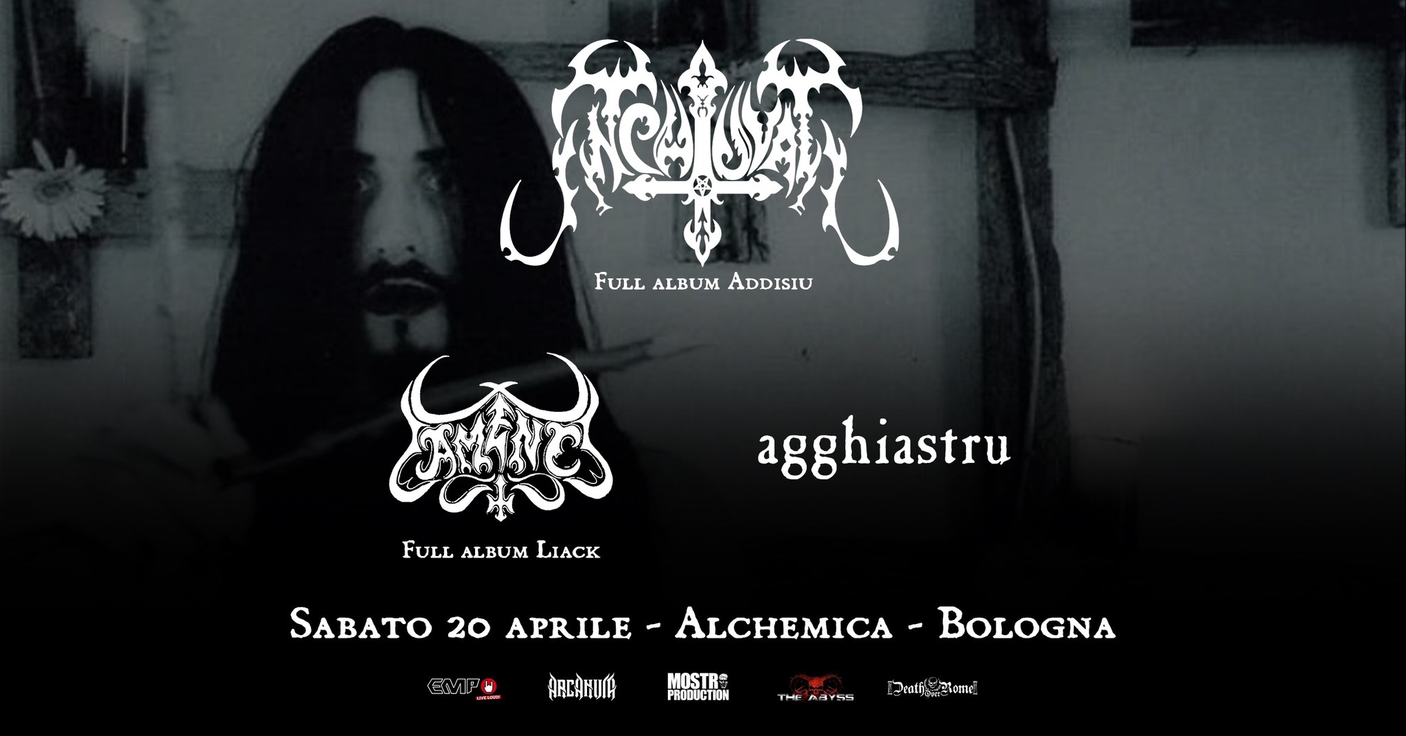 Il 20 aprile, giorno caro a noi tizi di Metal Skunk, quest’anno cade di sabato e ci offre un discreto imbarazzo della scelta: innanzitutto la serata che l’Alchemica di Bologna dedica alla Mediterranean Scene, con Inchiuvatu (che ripropongono l’intero Addisiu), Lamentu (che suonano tutto Liack) e lo stesso Agghiastru; poi il Monsters of Rez festival al Caseificio la Rosa di Poviglio (RE), con, tra gli altri, Injury, Raw Power e Modern Age Slavery; i Vision Divine allo Skulls Club di San Marino per il venticinquennale; il black stupramadonne dei Dervaza allo Ziggy di Torino; quindi i Rabia Sorda, gruppo del cantante delle leggende EBM Hocico, all’Ufo di Bergamo; e infine allo Slaughter bestemmioni e calci in bocca coi Diocletian insieme a Whiskey Ritual, Necromorbid, Necroblasphemer e altri.