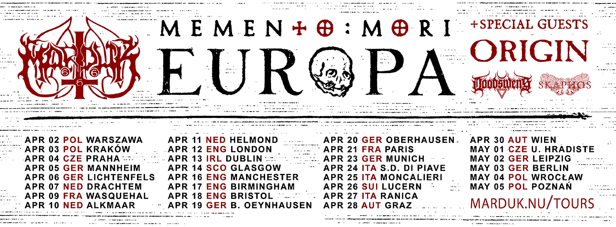 Sempre il 24 aprile inizia l’attesissimo tour italiano dei Marduk insieme ad Origin e Doodswens, che arriveranno in picchiata a bordo dei loro Stuka per tre date: il 24 al Revolver (San Donà di Piave), il 25 all’Audiodrome di Moncalieri (TO) e il 27 al Druso di Ranica (BG).