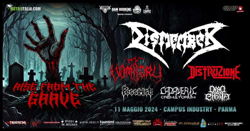 Grande evento (con tanto di trasferta di una corposa delegazione di Metal Skunk) al Campus Industry di Parma l’11 maggio: il festival death metal Rise from the Grave, con i Dismember a guidare la truppa composta da Vomitory, Distruzione, Pessimist e via dicendo. Lo Ziggy Club di Torino propone una serata sempre death metal ma più sperimentale, con i Syk protagonisti. Se siete più in vena di viaggi mentali potreste dirigervi al Central Rock Pub, dove suonano i Kayleth accompagnati da Lucerna e Maison Dieu. Altrimenti, se vi sentite in vena di ricordi adolescenziali, segnaliamo lo Ska Fest al Legend coi Vallanzaska. O ancora, se siete di Genova e non vi va di spendere soldi per la benzina, al Crazy Bull ci sono i Genus Ordinis Dei.