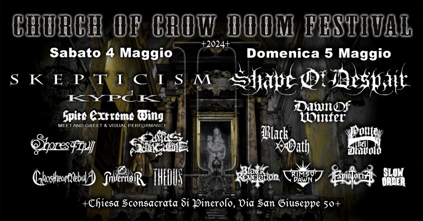 Da segnalare sul calendario i due festival in programma il weekend del 4 e 5 maggio: al Freakout l’Heavy Psych Sounds Fest, con, tra gli altri, Bongzilla, Mondo Generator, Ufomammut e Kadabra; e poi, alla chiesa sconsacrata di Pinerolo (TO), la seconda edizione del Church of Crow Doom Festival, con un bill pazzesco di cui vanno segnalati quantomeno Skepticism, Shape of Despair, Spite Extreme Wing (!!!) e i KYPCK di Sami Lopakka dei Sentenced.