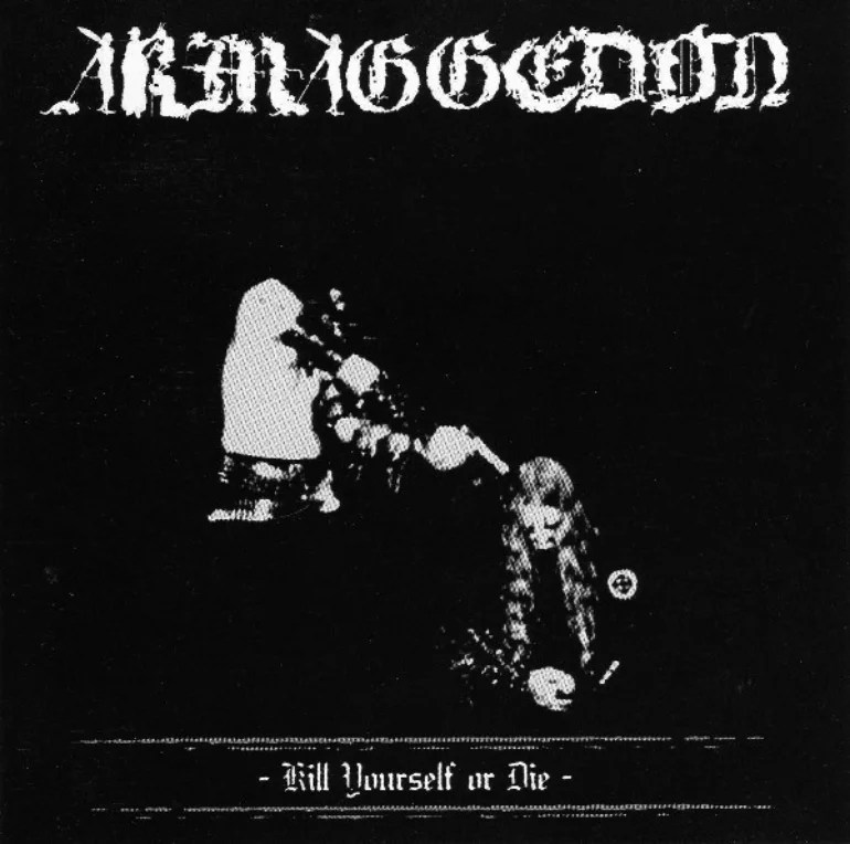 A dimostrazione che l’essere umano per sentirsi a suo agio psicologicamente ha bisogno di idoli da venerare, vale la pena analizzare quello che vent’anni fa è stato il fenomeno Armaggedon, duo francese composto da Grimvald (suoi anche gli Aktion T4) e da SSatan (urrah), formatosi nel 2002 e immediatamente protagonista di una miriade di pubblicazioni tra demo, split, EP per un totale di tredici titoli usciti tra il 2002 e il 2004, compreso il full del quale si celebra oggi il ventennale, Kill Yourself or Die, il loro debutto sulla lunga distanza.