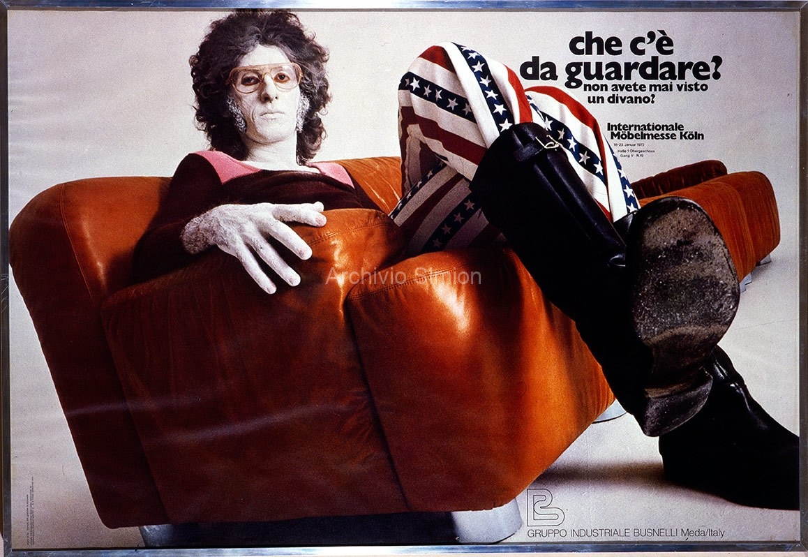 Milano, 1971. Non so dire che giorno fosse, o che clima o che stagione ammantasse quel giorno la metropoli dei gas di scarico, del cemento e delle ciminiere. Mi piace ovviamente pensare che fosse un giorno di nebbia. Non tanta, giusto atmosfera, quella nebbia che non sai se è vapore o smog. Immaginiamo che fosse proprio uno di quei giorni il giorno in cui gli operosi meneghini, al risveglio, si trovarono dappertutto sui cartelloni pubblicitari della città una nuova réclame (ecco che nella mia ricostruzione parzialmente di fantasia è indispensabile che la nebbia non fosse poi molta). Era la nuova pubblicità di una ditta di divani, la Busnelli, e fin qui nulla di strano. Sappiamo del rapporto tra la città lombarda e l’industria dei componenti di arredo (aka “del design”). Ne è tanto ossessionata, Milano, che per il fatto di ospitare ogni anno una fiera delle seggiole, dei tavolini scomodi e delle lampade improbabili si crede una capitale rinascimentale, oggi, dimenticandosi di esserlo stata veramente, secoli addietro. Non fu quindi il settore merceologico a distrarre gli operosi meneghini dal loro tragitto mattutino verso l’opificio, tanto da costringerli ad inondare di proteste la casella postale della Busnelli. Lo scandalo era dovuto a quanto era effettivamente rappresentato dallo scatto dell’agenzia publicitaria di Gianni Sassi, fondatore della Cramps Records (Area, Skiantos…), pubblicitario e, in generale, quel che si suole definire un “agitatore culturale”. Centrale nello scatto è uno strano figuro, seduto proprio su uno dei divani della ditta che si vuole pubblicizzare.
