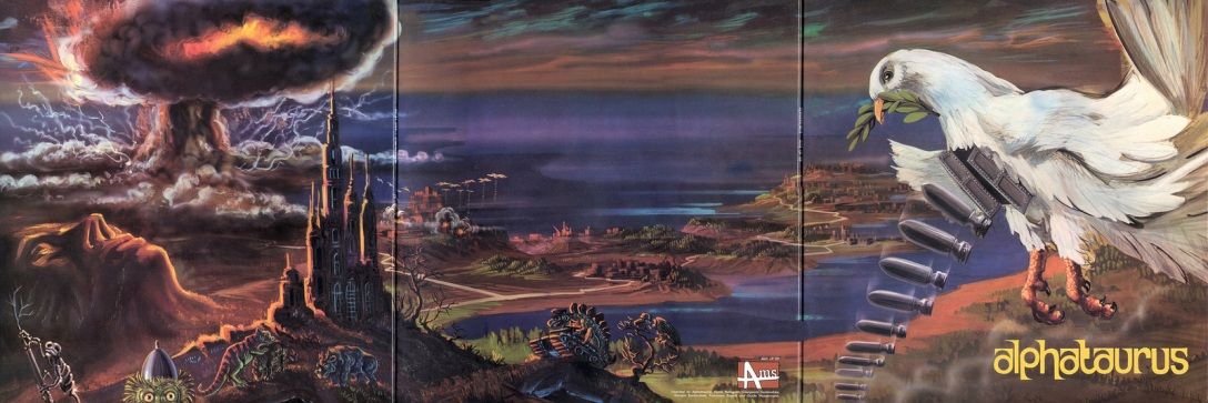 Altra copertina eloquente (un vero capolavoro dell’arte delle copertine progressive dell’epoca dell’artista Adriano Marangoni) è quella dell’esordio dei milanesi Alphataurus, pubblicato sempre nel 1973 dalla Magma di Vittorio De Scalzi (poi contestualizziamo). In pratica, sullo sfondo di un fungo atomico e di un castello fantasy, in primo piano una colomba di pace sgancia da un portellone nel ventre gli ordigni che andranno a esplodere al suolo. Non so se già all’epoca si parlasse di guerre umanitarie, ma scommetto che non si sia iniziato troppo di recente a giustificare i bombardamenti in nome della pace.