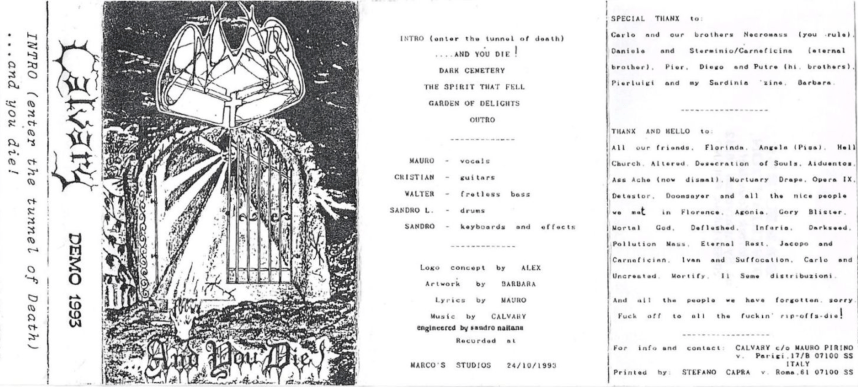 Questi pochi esempi non sono scelti a caso: sono album che rappresentavano una parte di un generale moto di cambiamento che si stava verificando in tutto il mondo, che si sentiva chiaramente a livello underground e che poi si rifletteva anche nelle uscite ufficiali. Chiamiamola espansione, chiamiamola rivoluzione, sta di fatto che moltissimi gruppi metal stavano esplorando nuove possibilità, fondevano generi e creavano atmosfere inedite, originali. Tutto l’universo del metal era un big bang in espansione velocissima, nascevano stili e sottogeneri che erano impensabili fino a pochi anni prima. Fra le varie evoluzioni a cui si assisteva nel metal estremo, il death stava diventando sempre più multiforme e alcune sue correnti stavano diventando complesse e raffinate, pur mantenendone l’aggressività e l’oscurità di base. Riprendendo la storia dei due gruppi sardi, possiamo affermare che, così come gli Ass Ache colsero l’ondata di estremizzazione del nuovo grindcore alla fine degli anni Ottanta, i Calvary erano sul fronte dell’avanguardia metal dei primi anni Novanta, proponendo quella che all’epoca era una musica completamente nuova, fatta di death metal, black mediterraneo, melodia, unito a una tecnica evoluta e a una libertà compositiva non lontana dal progressive.