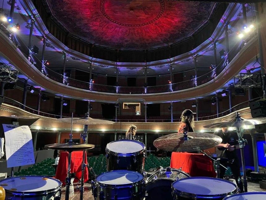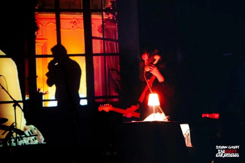 Il Palco19 di Asti è un teatrino polifunzionale di tutto rispetto, piccino ma ben tenuto e curato dal personale addetto che lavora duramente, bei soffitti decorati e ottima acustica. Il posto perfetto per uno spettacolo del genere, raccolto ma con un palco sufficientemente ampio da accogliere comodamente i cinque musicisti con cinque tastiere, due chitarre acustiche, due chitarre elettriche, un sassofono, due bassi, batteria ed elementi scenici sparsi composti da tavolini ornati da drappi rossi con sopra abat-jour e i telefoni della Sip grigi con selettore circolare anni ’80 usati figurativamente durante le telefonate degli attori. Sul lato un manichino bianco. Se cominciate a perdere le bave lo capisco, ma questo non è che il contorno di un esecuzione perfetta in cui tutto viene suonato, ogni effetto, ogni accordo; giusto le voci degli attori che tratteggiano la trama di questo film fittizio sono registrate.