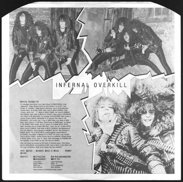 Infernal Overkill è uno dei primi esempi di purissimo thrash alla tedesca, che si affiancò al lavoro di Sodom, Kreator e Tankard, quando ancora non esisteva o non si sapeva come usare il termine “thrash metal”, però vi ricordo che i Destruction arrivarono prima, per lo meno nella cronologia delle pubblicazioni tedesche. Dobbiamo sottolineare che negli Stati Uniti stava succedendo la stessa cosa in quegli anni, ovvero si stava svolgendo una contemporanea estremizzazione del metal classico, ma la declinazione americana di questo fenomeno sarebbe arrivata ad esiti molto diversi: i Metallica e la Bay Area, con la grande eccezione degli Slayer a rappresentare la punta più nera del thrash d’oltreoceano. Non è tutto qui, anzi, la cosa interessante è che i Destruction, con il loro speed – thrash ben suonato, ma comunque crudo e maligno, furono importantissimi anche per lo sviluppo del futuro black metal alla norvegese, come viene affermato dai musicisti e dai saggisti, per esempio da Dayal Patterson nel suo Black Metal: Evolution of the Cult, recentemente ristampato da Cult Never Dies, dove vengono ricordati insieme ai loro compatrioti per il peculiare contributo che diedero alla genesi del black metal moderno. Anche il famoso Decibel Magazine ha inserito Infernal Overkill nella sua Hall of Fame, celebrandolo per l’influenza che l’album ha esercitato su generazioni di gruppi thrash e black metal: