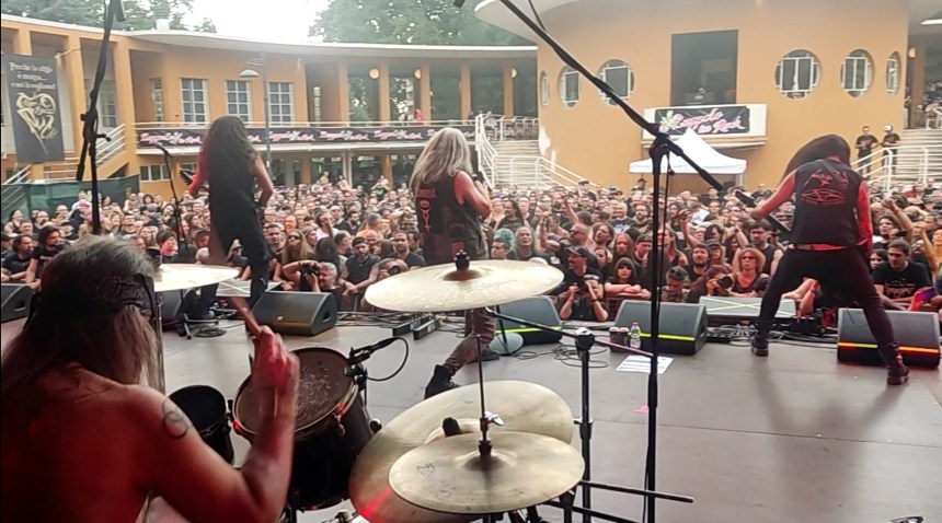 Fino a questo momento sono quasi sempre rimasto bello spaparanzato all’ombra su una comoda sediolina in un’area rialzata di fronte al palco, ma ora è tempo di fare sul serio e ficcarmi nel mezzo al casino, perché potrebbe essere l’ultima volta che vedo i NECRODEATH e quindi voglio godermela fino in fondo. Cominciano con Hate and Scorn e poi proseguono tra pezzi vecchi(ssimi) e più o meno nuovi, ma è con The Creature che esco veramente di testa, perché è il primo loro pezzo che abbia mai ascoltato, appena uscito, e tuttora lo considero un capolavoro incredibile. Appena finisce un tizio affianco a me mi dà una pacca sulla spalla e mi dice: “Ti piacciono, eh?”. Sullo stato di grazia del gruppo confermo tutto quanto detto da Ciccio e Stefano Mazza che avevano già avuto l’occasione di vederli dal vivo durante questo tour d’addio. E, se ciò non bastasse, confermo anche quest’altro articolo di Ciccio sull’argomento. La chiusura con Mater Tenebrarum mi fa ripromettere di doverli vedere almeno un’altra volta ancora, prima della parola fine.