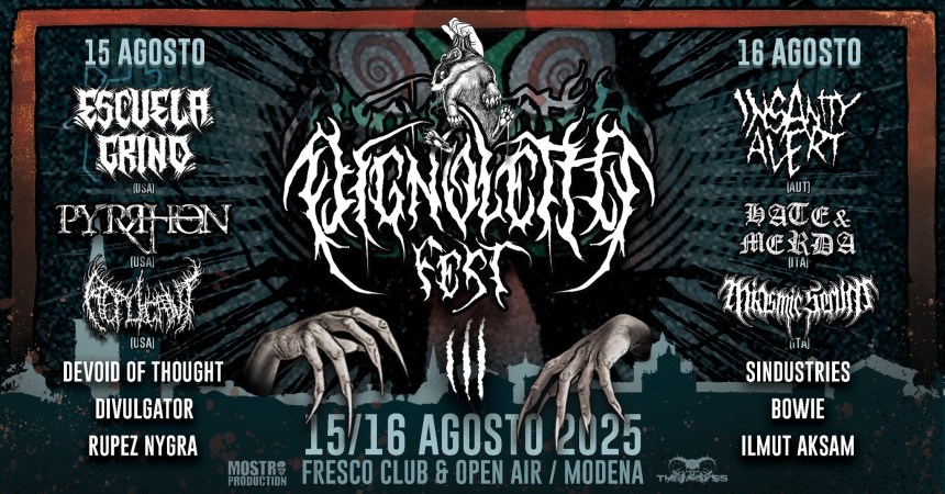 A Ferragosto inizia il Pignoletto Fest, evento open air di metal estremo al Fresco Club di Modena. Nella prima giornata sei gruppi tra cui i messicani Escuela Grind, gli statunitensi Pyrrhon e Replicant e i nostri connazionali Devoid of Thought. Contemporaneamente c’è un’altra giornata del Summer Crock Fest, stavolta con i Sick’n Beautiful.
