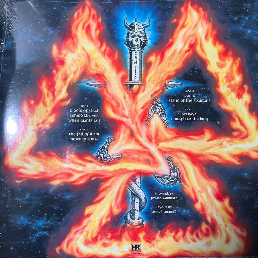 Gates of Fire, come gli altri dischi dei Manilla Road, richiede una certa attenzione: non va solo ascoltato, ma anche guardato, letto. È un disco che va contemplato, altrimenti si rischia di non cogliere una buona parte dell’opera, che è ovviamente musicale, ma la musica ha anche la funzione di accompagnare la parte letteraria del lavoro, come tutto il buon epic metal, del resto, deve saper fare. A questo proposito, l’illustrazione di copertina è fortemente simbolica e ci indica che nell’opera ricorre il numero tre: tre triangoli intrecciati, che ricordano un simbolo della tradizione nordica, i quali rimandano a tre storie e in effetti la narrazione si articola in una precisa trilogia di racconti distinti: The Frost Giant’s Daughter, ispirato all’omonimo racconto di Robert E. Howard; Out of the Ashes, ispirato all’Eneide di Virgilio e Gates of Fire, che racconta la resistenza spartana alla battaglia delle Termopili. Quindi abbiamo letteratura fantasy, epica classica e storia.