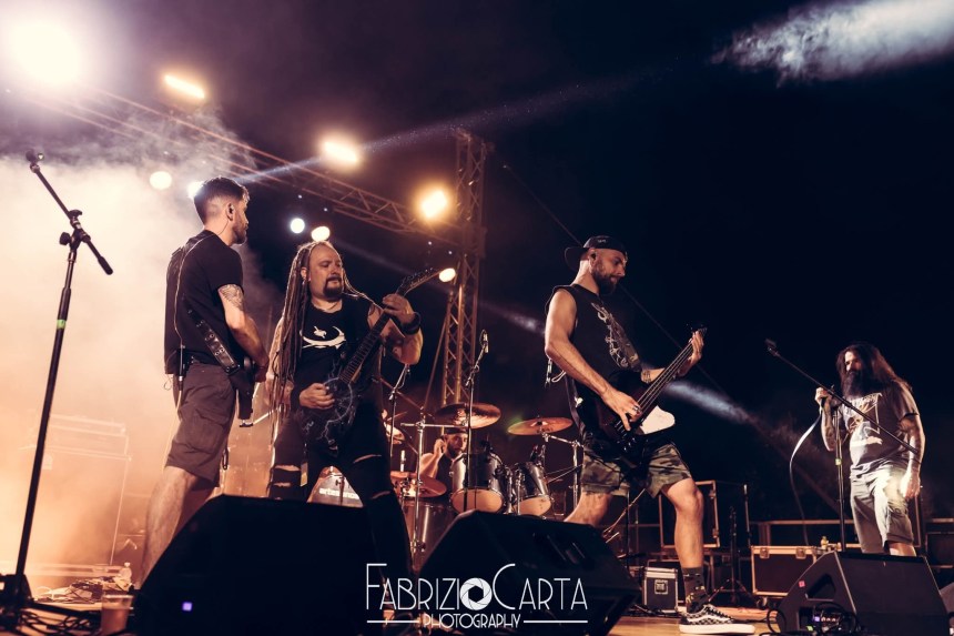 Aprono le danze i DEXAL, band del settore meridionale autrice di un Lp del 2019 che non ha ancora avuto seguito ma prometteva bene, e non solo per titoli migliori del mondo come Fuck You We’re from Trexenta. Groove thrash che parte dai fondamentali (Pantera, Sepultura e così via) e si tuffa in un puzzolente pantano sludge, dal quale riemerge inzaccherato di scorie southern. Pezzi come Trust and Steel hanno il piglio degli esponenti più lerci di quella specifica scena Usa. Esibizione nerboruta e divertente, salubre e rinfrescante come le birre che ho già smesso di contare. A fine concerto ci si interroga sulle dinamiche della familiarità dei Dexal con Alex Magni, che compare come sponsor illustre sul loro canale YouTube e vanta pure un brano dedicato alla sua opera, intitolato 100×100, dal toccante testo metà in inglese e metà in sardo.