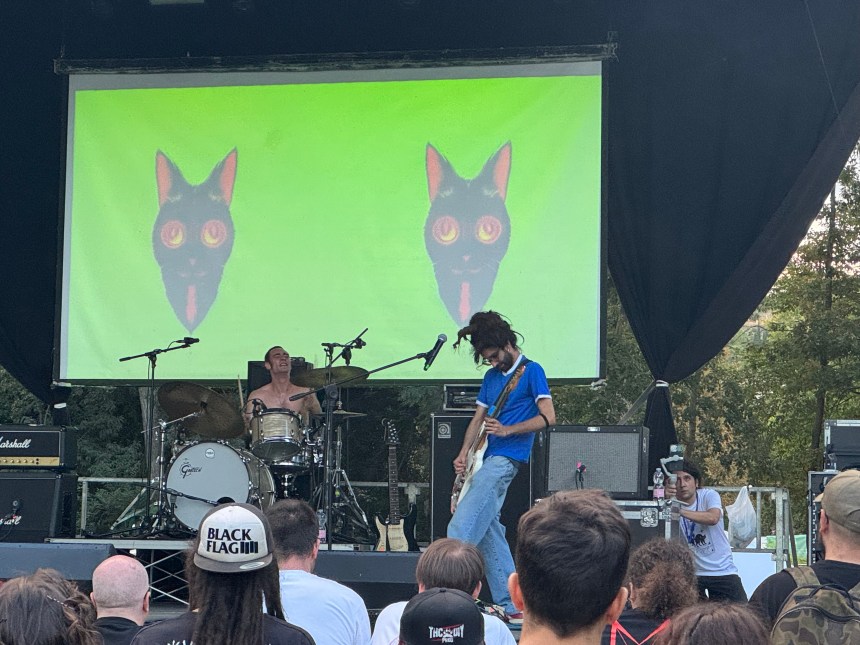 Si inizia presto e in orario, o forse con un ritardo minimo poi recuperato nel corso della giornata (dal coprifuoco a mezzanotte non si scappa). I primi ad esibirsi sono i JENNIFER IN PARADISE: pagano lo scotto di suonare davanti a un pubblico ancora piuttosto esiguo, ma senza conseguenze sulla loro prestazione, che resta comunque intensa. Quello che fanno mi suona familiare, con la particolarità dei testi in italiano (che in questo caso ho apprezzato particolarmente); in realtà non riesco a trovarne i riferimenti esatti, la cosa quasi mi tormenta per i primi due pezzi fino a che decido che non ha molta importanza e mi godo lo spettacolo. È un punk-HC melodico con venature di spleen: musica per la fine dell’estate, per quando le ombre sono lunghe e il sole è ancora caldo, ma non troppo; ciò che li rende perfetti per questo momento. Avrebbero meritato qualche presenza in più, spero di rivederli presto.