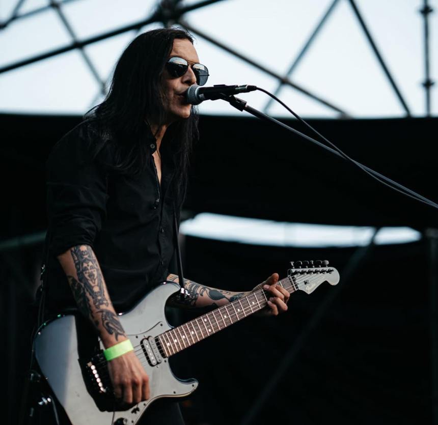 Poco dopo, in uno scenario simile, arrivano i THE SADE da Padova, trio gotico o “dark” come si diceva quando ero pischello io (svariati Papi fa). Il colore e il calore sono tutt’altri. Il suono è notturno e la presenza del sole è per loro motivo di esplicito rammarico, sicuramente non la condizione ideale per quel che propongono. Ma, nel meteo, io come gli altri presenti ho trovato grosso motivo di sollievo: erano previsti acquazzoni e invece a fine giornata non sarà caduta neanche una goccia. Che sia luce o buio, loro fanno comunque un bel concerto, come da coordinate del genere (che non è certo quello in cui sono più ferrato): tutto gira principalmente intorno a corpose linee di basso che, con poca fantasia, definirei alla Peter Hook. In un certo senso con questo secondo set si anticipa in maniera abbastanza chiara quale sarà la direzione della giornata, con un bill variegato ma che, nelle sue varie declinazioni, sembra scindersi tra sonorità punk e gothic in reciproca alternanza. Saranno proprio poi gli headliner a rompere questo canovaccio (in maniera eccellente tra l’altro). Ah, suono ottimo e tutto si sente benissimo, cosa che con qualche aggiustamento qua e là varrà un po’ per tutti.