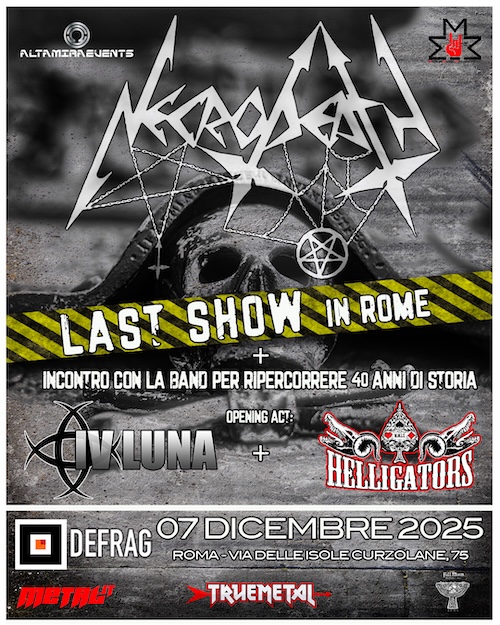 Sabato 6 il Defrag ospita gli storici Raff insieme a Hellcrash, Konquest e Braindead. Il Traffic risponde con una bella serata goticona: il Wave Fest con Ash Code, Ys Lavey (cioè Young Signorino) e Olgha. Non lontano in linea d’aria, al Friccicore, abbiamo un raffinato happening accaccì con 217/ The Cheapheads/ Casus Belli (daje Teschio) Fuori GRA, al Crossroads, si esibisce invece Kiko Loureiro con la sua banda. L’appuntamento da non mancare è quello con l’ultimo concerto dei Necrodeath a Roma, e penultimo di sempre, al Defrag. In apertura Helligators e IV Luna.