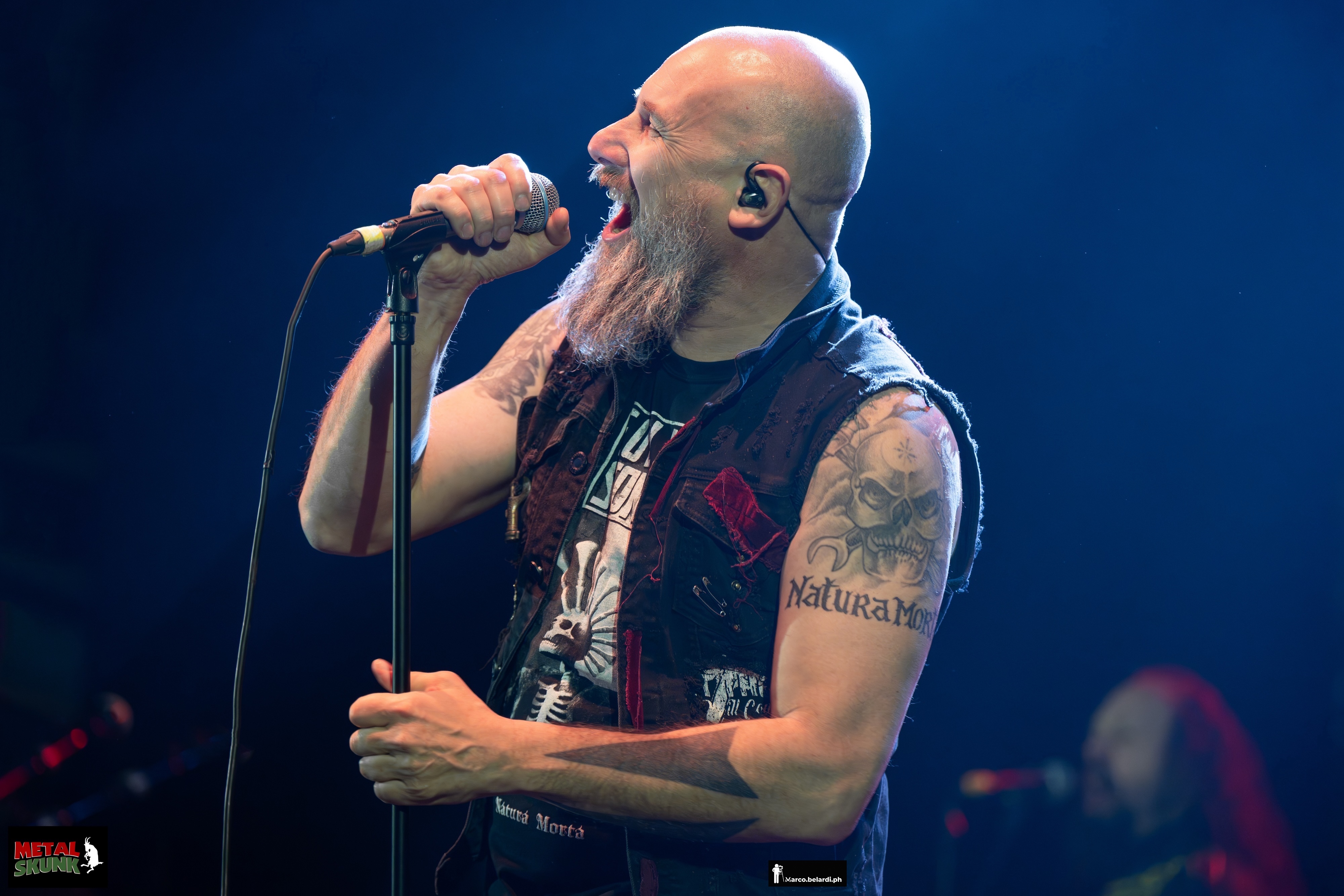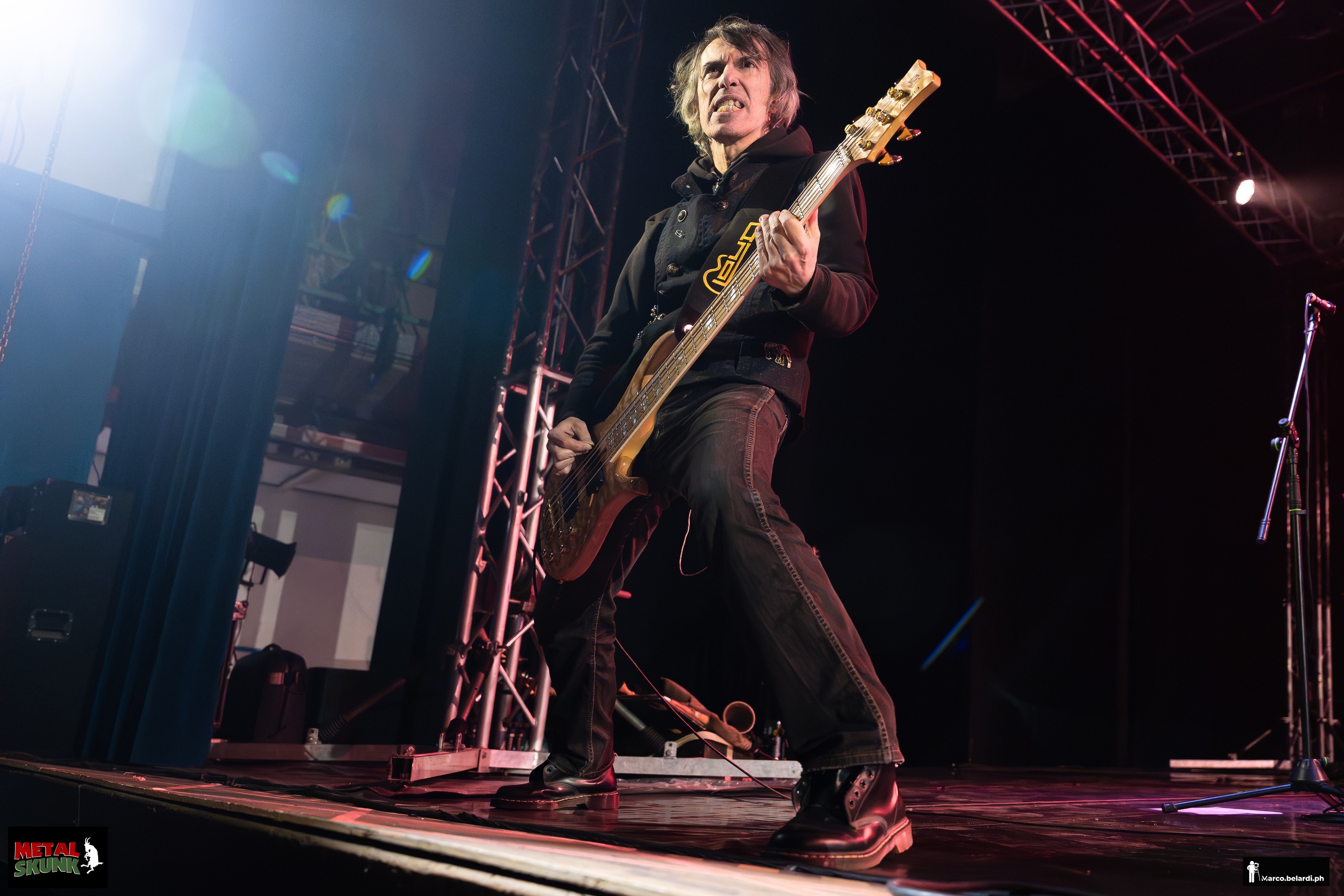 La Casa del Popolo di Grassina l’ho trovata gigantesca. Il navigatore mi aveva pure fatto sbagliare strada, tanto che mi ero ingegnato per parcheggiare in una angusta stradina senza fondo, per poi scoprire che il parcheggio della Casa del Popolo fosse a sua volta gigantesco. Pochi metallari fuori, qualcuno in più al bar a rifocillarsi chi di birra, chi di cioccolata calda e intrugli del genere. Sulla mano mi hanno fatto il timbro cinque o sei volte, sempre sopra allo stesso punto: quando l’ho guardato assomigliava a una via di mezzo fra un vaccino per il vaiolo, un tumore e un pestaggio in piena regola. Se mai l’avesse visto il mio medico curante, che per l’occasione saluto, mi avrebbe subito prescritto duecento euro di analisi del sangue da fare con estrema urgenza. Vista da dentro, l’area concerti era enorme, e non saprei paragonare la sua capienza a quella del Viper Theatre originale, che si aggirava attorno agli ottocento o novecento posti. Il soffitto l’ho trovato altissimo, e riscaldare l’ambiente è stato pressoché impossibile per i presenti, che ho stimato fra le duecentocinquanta e le trecento anime. Ma fidatevi fino a un certo punto, perché, quanto a stime sui presenti, io faccio schifo. L’errore più grosso l’ho fatto lasciando il parka all’attaccapanni, e presentandomi alla transenna per i fotografi con indosso una felpa leggera col cappuccio. Il mal di gola non mi è ancora andato via.