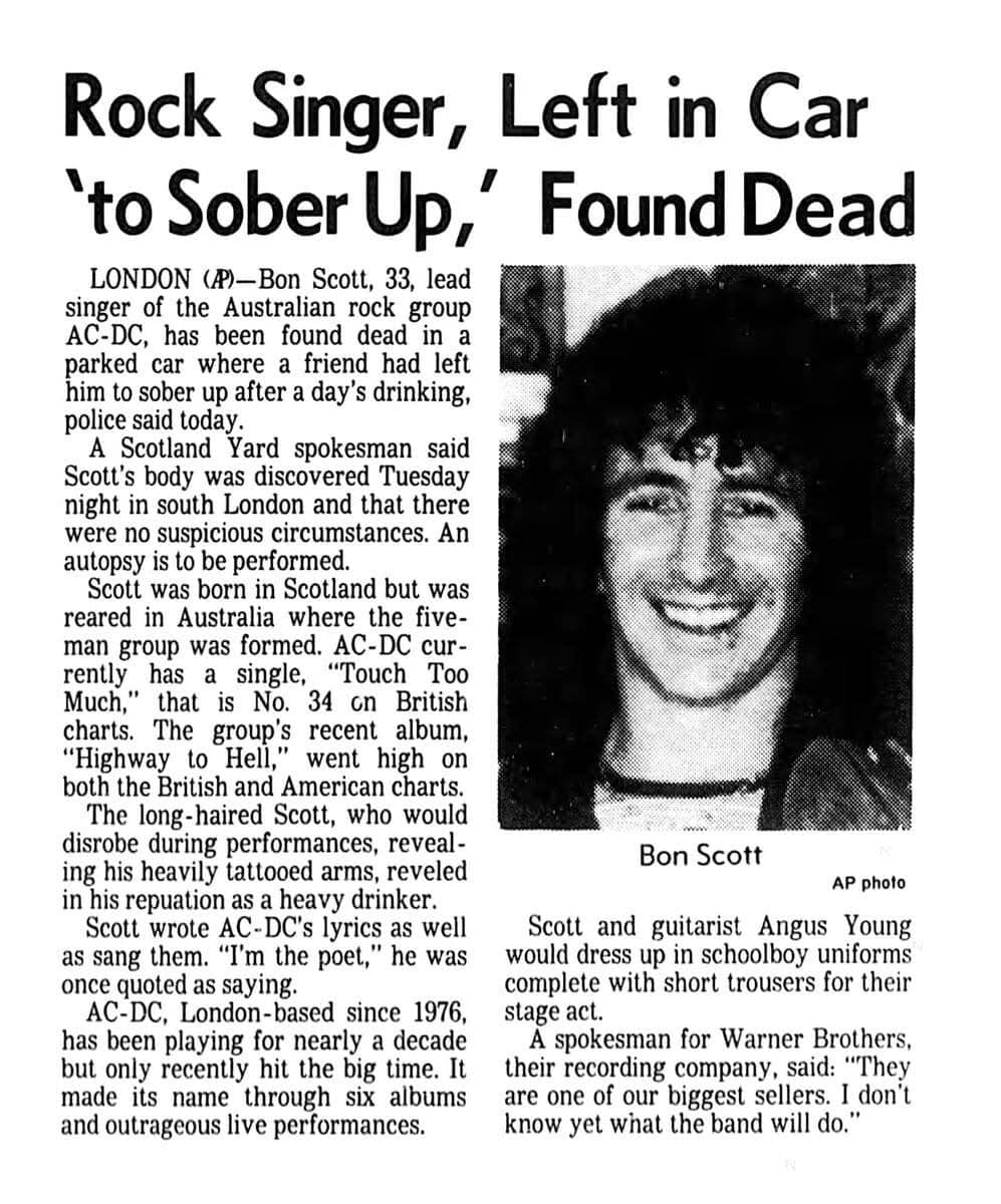 Facciamo un passo indietro. La versione ufficiale sulla sua morte è nota: Bon Scott è rimasto soffocato dal proprio vomito dopo una sbronza particolarmente pesante, mentre dormiva nella macchina parcheggiata di tale Alistair Kinnair, che lo aveva lasciato lì per fargli smaltire l’ubriacatura. Questa versione non è mai stata messa davvero in discussione, perché certificata all’epoca dal medico legale e confermata anche da amici e familiari, compresi i fratelli Young.