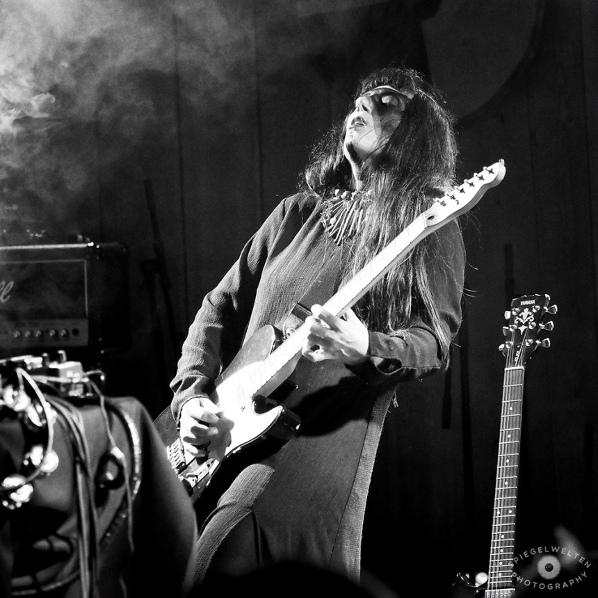 È quindi il momento di abbandonarsi al carisma soffuso di LILI REFRAIN. vecchia conoscenza dei nostri lettori. Lo so che è la solita frase fatta del piffero da scribacchino che vuole vantarsi del suo grande intuito, però, ecco, fa sempre piacere quando artisti che ti avevano fatto saltare dalla sedia agli inizi delle loro carriere, con cui avevi fatto una testa così ad amici e conoscenti perché li ascoltassero, si evolvono in realtà consolidate con una crescita artistica che li porta sui palchi internazionali più di prestigio. Lili Refrain è diventata un altro patrimonio nazionale di cui andare orgogliosi, come, che so, i Messa o gli Ufomammut. L’inserimento della polistrumentista capitolina non è affatto fuori posto in una serata black metal, anzi. Ogni volta è un rituale. La sacerdotessa chiama a sé una tribù che non sa ancora di essere tale. Il messaggio è chiaro a tutti quanto esoterico. Perché, in un certo senso, è musica sacra.