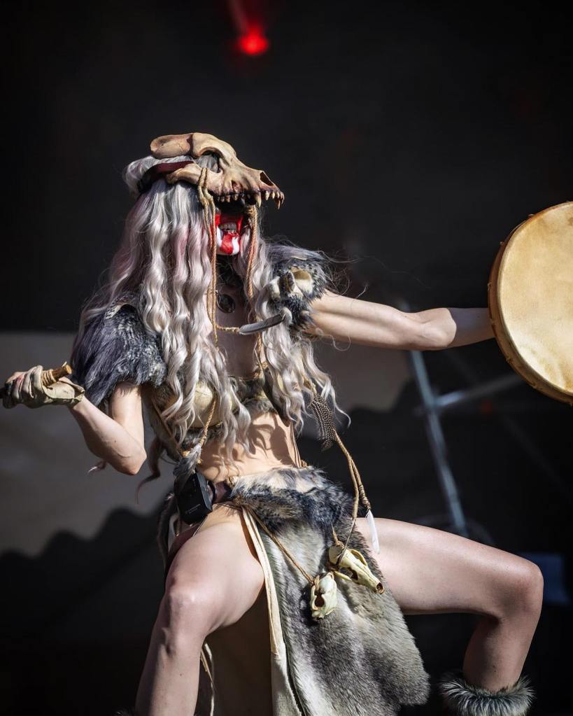 Durante il cambio palco vengono messi nientemeno che i Wardruna e, quando compaiono gli Eihwar, ma soprattutto quando compare Asrunn, ovviamente, il pubblico va in visibilio. Il palco è riempito di neon che ruotano su se stessi e, insieme al duo, fanno uno strano effetto viking futuristico che sembra uscito da un fumetto Marvel – anche se lui, Mark, sembra quasi più mediorientale e dal suo vestiario e dal suo elmo me lo immaginerei di più sulla rocca di Alamut insieme alla setta degli Assassini. Non riesco a distinguere veramente una canzone dall’altra, ma d’altronde le composizioni sono tutte abbastanza simili tra loro: percussioni, elettronica, base dritta in 4/4, talvolta qualche strumento tradizionale campionato, strofa-ritornello-strofa-ritornello-ponte-strofa-ritornello e una parola urlata all’unisono (che sia Berserkr o Hugrheim cambia poco). A differenza di Mira Ceti, Asrunn salta e balla come un’ossessa sul palco e regge la scena in maniera diversa, molto fisica – non che non sia molto brava a cantare anche lei, come dimostra quando si placa e si concentra sulle linee vocali.